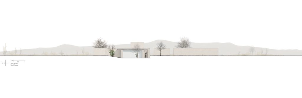 The wall also performs a practical role, protecting the house from a nearby road that runs parallel to the site. Yet its purpose is not defensive. It acts instead as a threshold, marking the moment when one passes from the ordinary territory of the road into a quieter domain shaped by landscape and shadow.