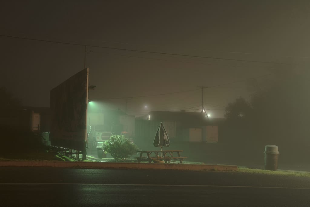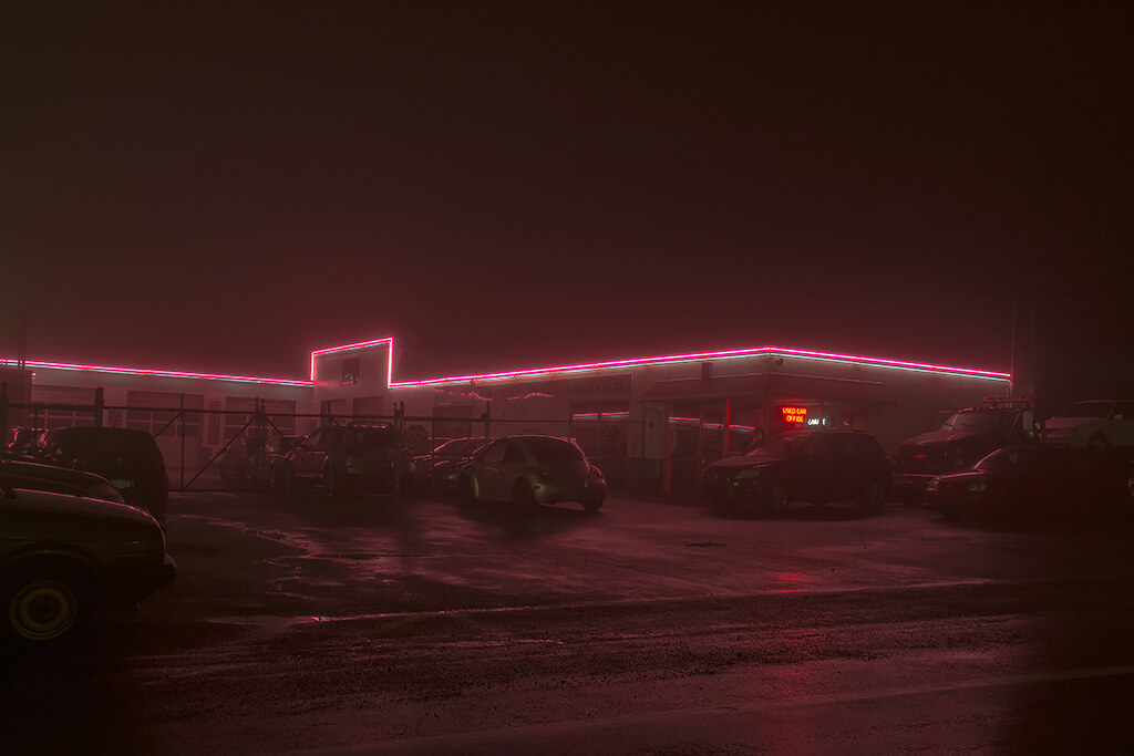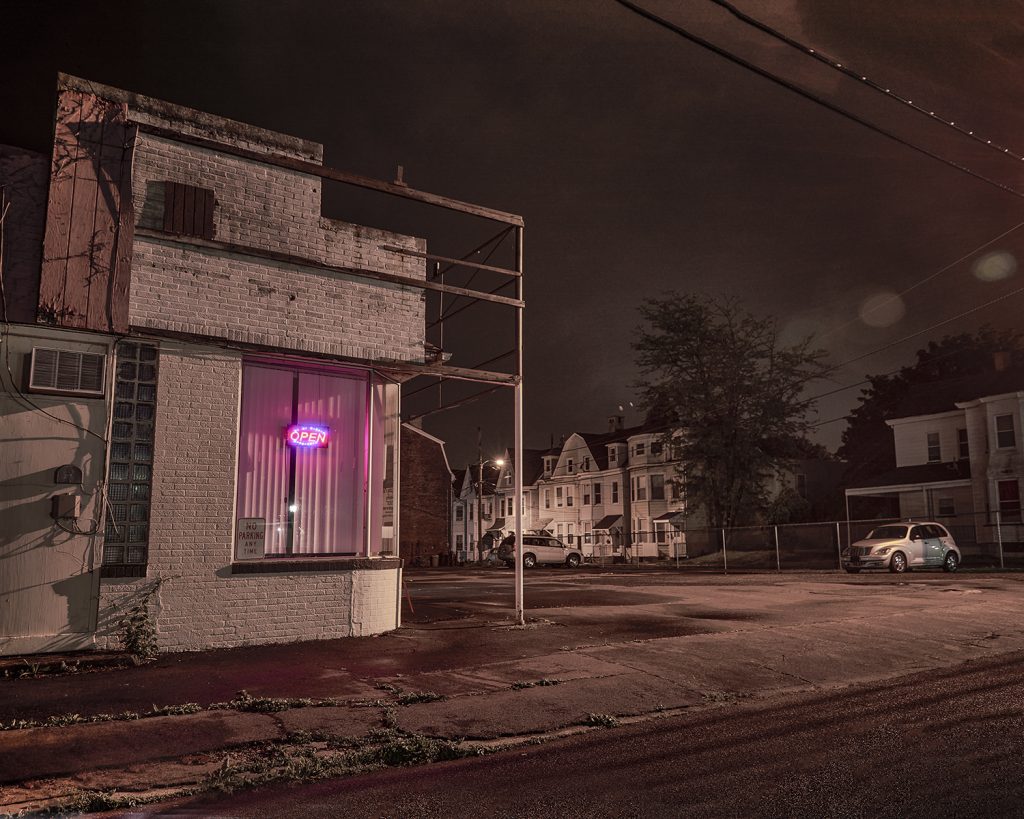Initiated in 2015, Easton Nights stands as the defining body of work in Peter Ydeen’s photographic practice. Shot in and around Easton, Pennsylvania, the series transforms familiar suburban and post-industrial scenes into atmospheres of quiet intensity. Inspired in part by George Tice’s night photography, Ydeen initially worked in black and white before embracing color, drawn to the complex palette produced by artificial light.