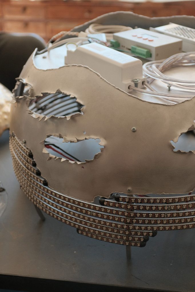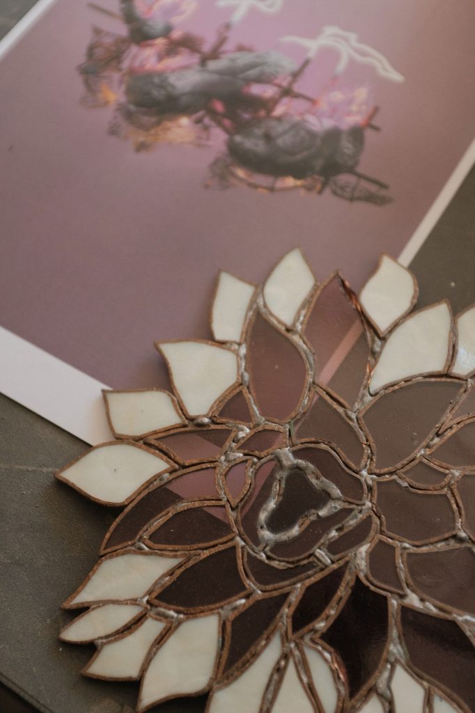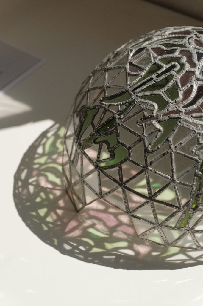 Light plays a central role in the studio. Stained glass casts patterned shadows on the walls. Reflections from copper sheets overlap with the cool glow of neon. Lambridis switches on a chandelier from a series recently shown in Paris. LED bulbs connect to vintage incandescent lights, colored glass panels are embedded with copper and aluminum sheets, and neon tubes coil around brass structures.