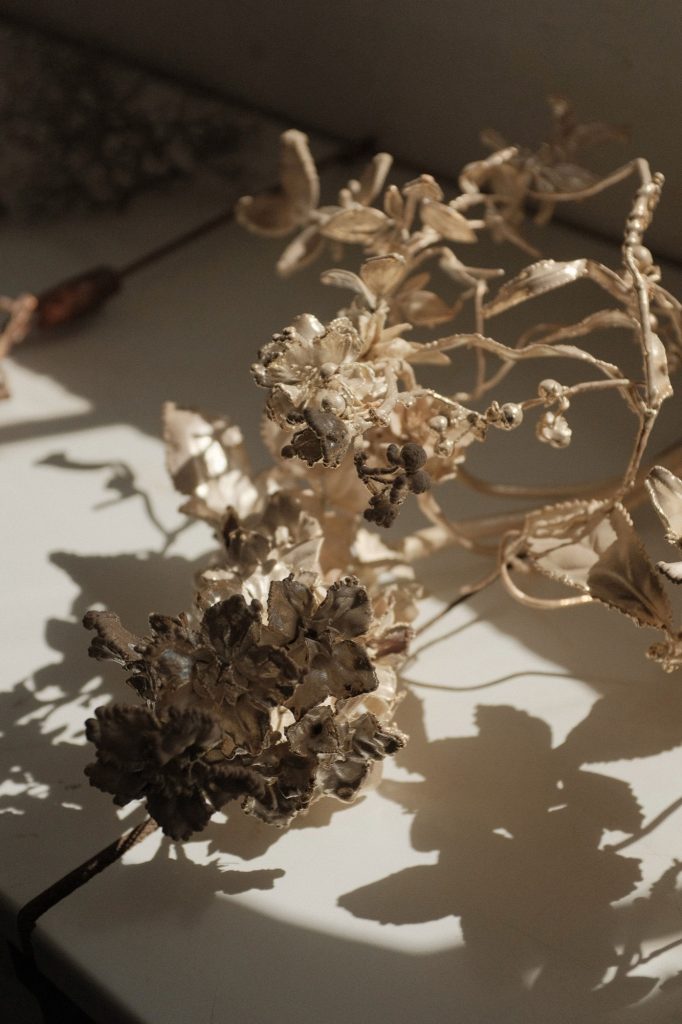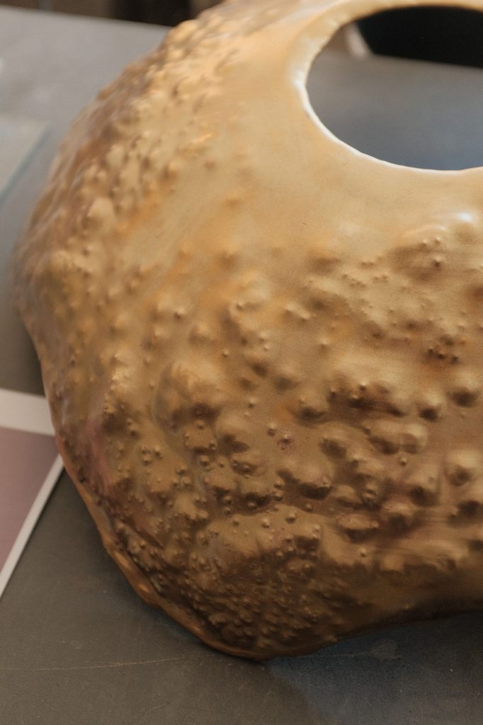 This attitude crystallized in Elemental Cabinet, the graduation project that first drew international attention. The piece echoes the silhouette of Florence’s most lavish Baroque furniture, while quietly undermining the logic of preciousness itself. Decorative references from ancient and contemporary craftsmanship coexist within a single object. Bronze, ceramics, embroidery, and fragments of melted plastic chairs are brought together, collapsing the boundary between original and reproduction, between noble material and everyday residue.