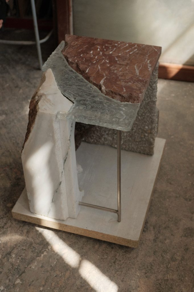 One early experiment involved completely crushing and reassembling an abandoned car. Its door was polished into a bar countertop, the original impact marks now resembling organic grain. “You can’t even tell it was a car door anymore,” he says, laughing. Nearby, a table composed of two stones presents a quieter dialogue. Sunlit white marble appears soft and almost warm, while the concrete side remains raw and unresolved. Between them, a translucent plastic surface mediates the transition, creating a delicate balance between opacity and transparency, refinement and tension.