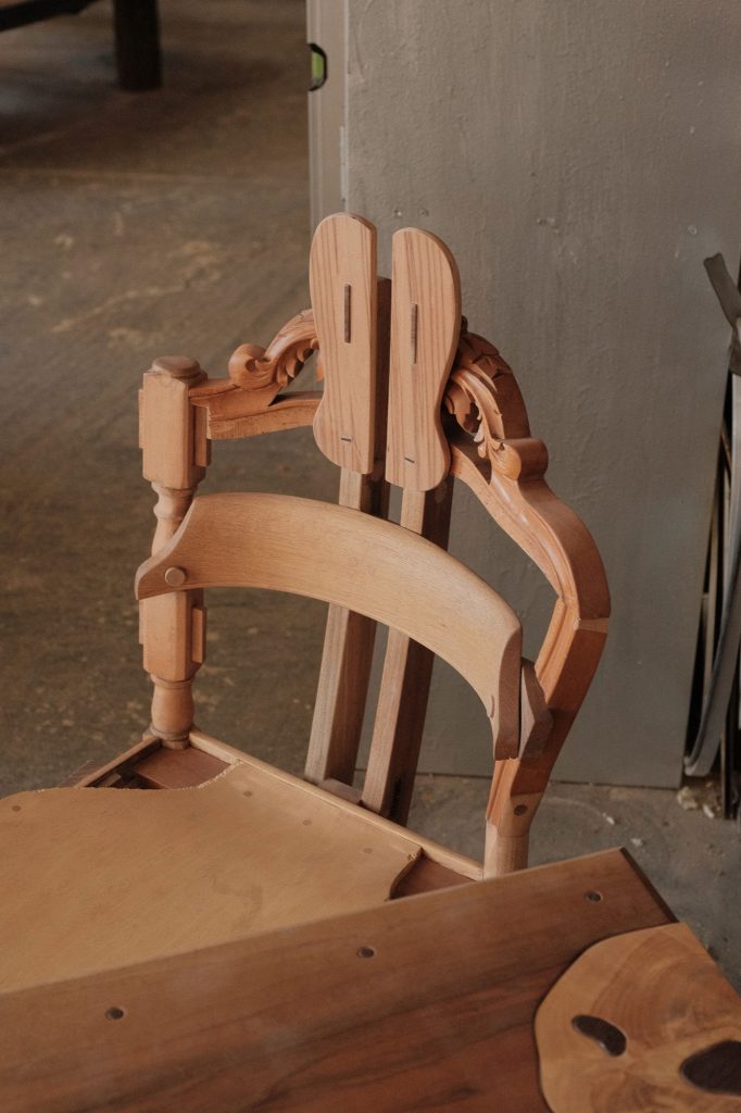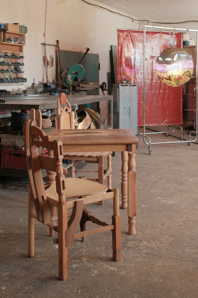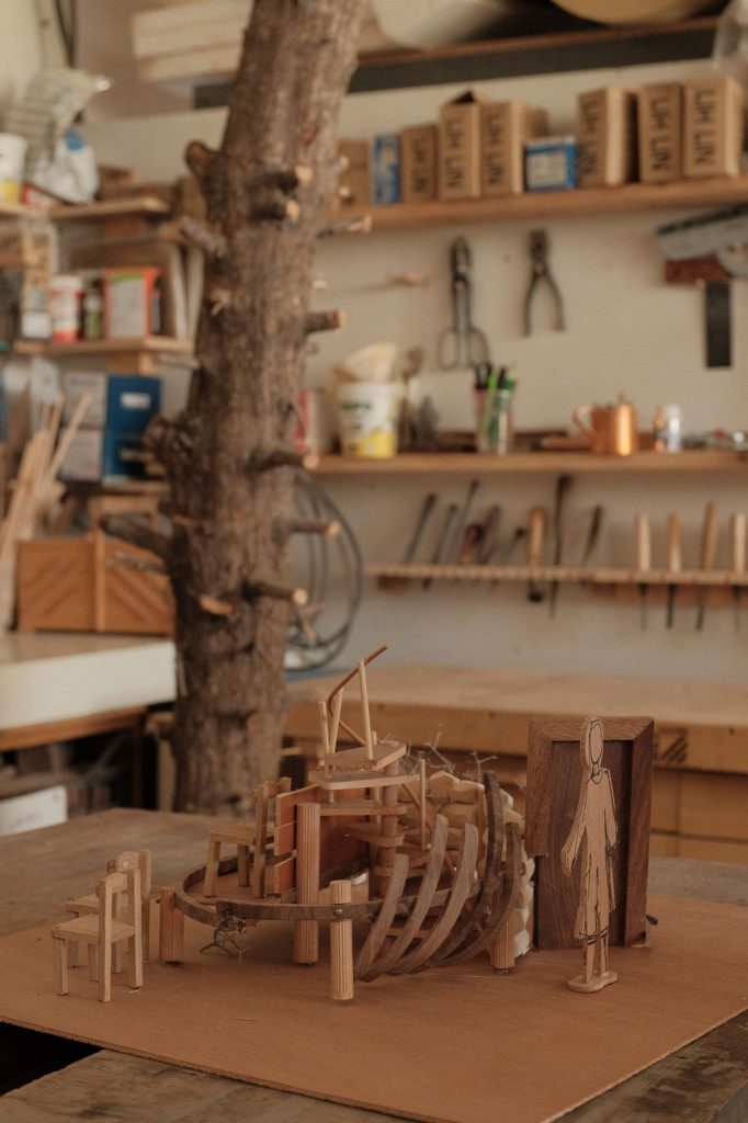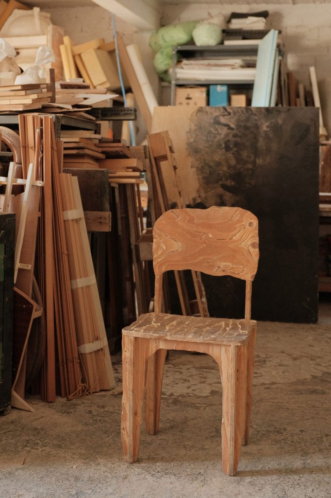 Beyond the blue iron door, the studio reveals itself through smell as much as sight. The earthy scent of aged timber blends with the sharp clarity of polished metal. The space feels less like a workshop and more like a living archive, each zone quietly devoted to a different state of matter. Wood logs over two meters tall stand upright and solemn, while carved blocks await their next assembly. Metal fragments bear unusual textures, their surfaces telling stories of pressure and alteration. Marble reflects a cool, restrained light, while plastic elements scatter color across worktables.