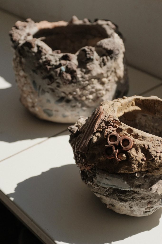 On another surface rests a model for a stage installation. Within days, it will rotate against the backdrop of the Acropolis, opera performers moving in orbit around it. Once again, the classical and the contemporary enter into dialogue, neither dominating the other. As we prepare to leave, small planters on the windowsill draw attention. Metal fragments are embedded in concrete, from which green shoots emerge. Materials once discarded now appear quietly alive, activated by light and care.
