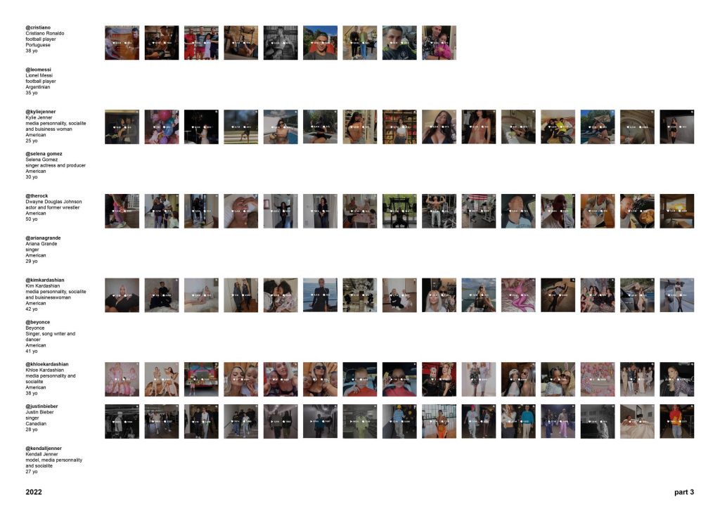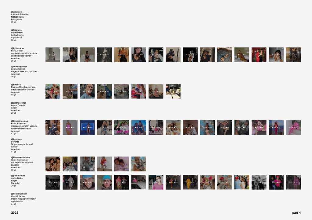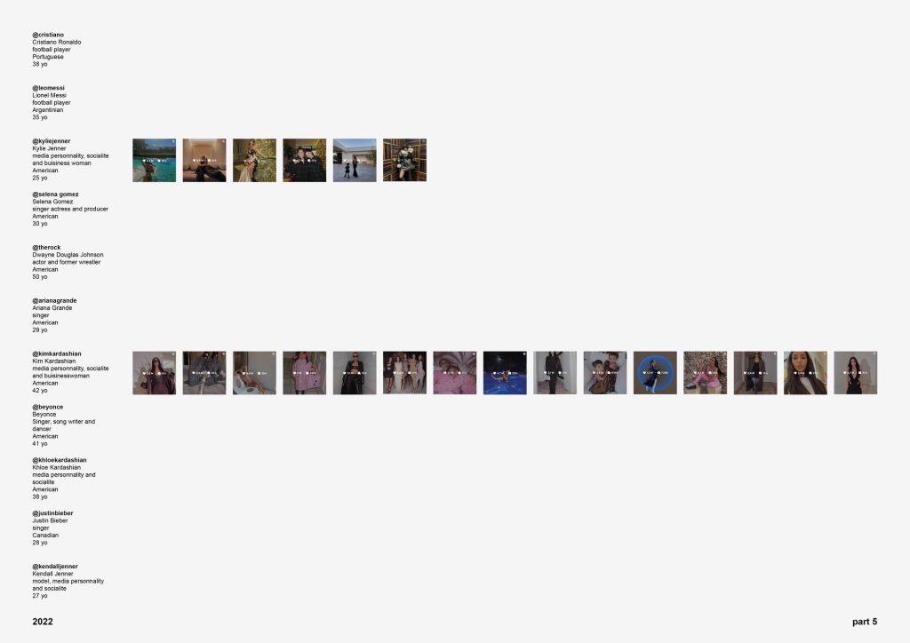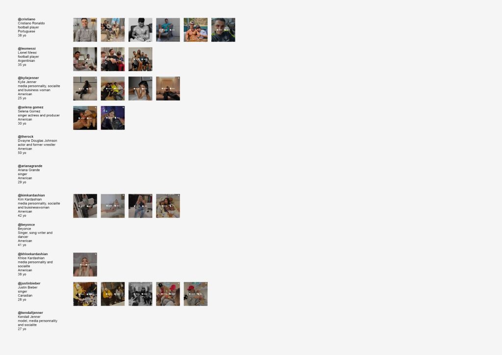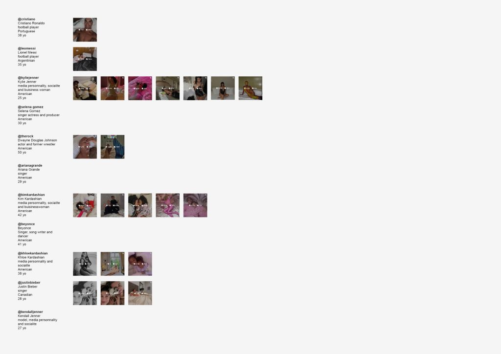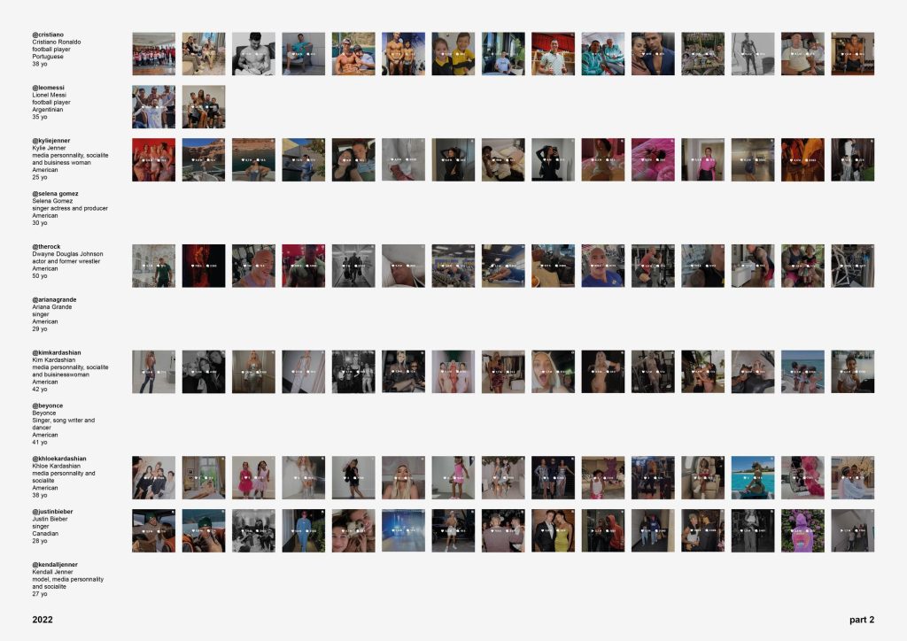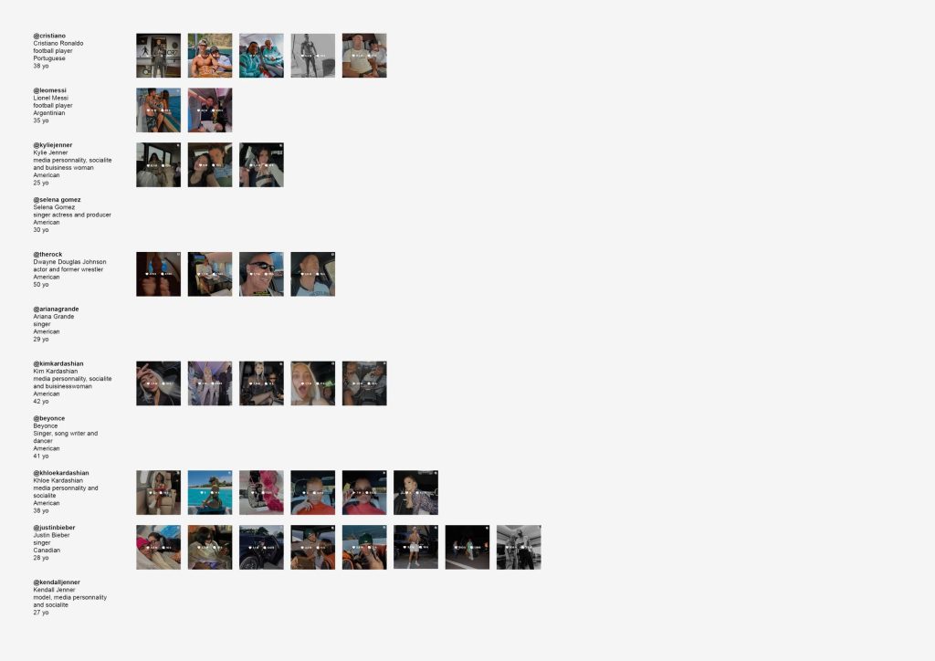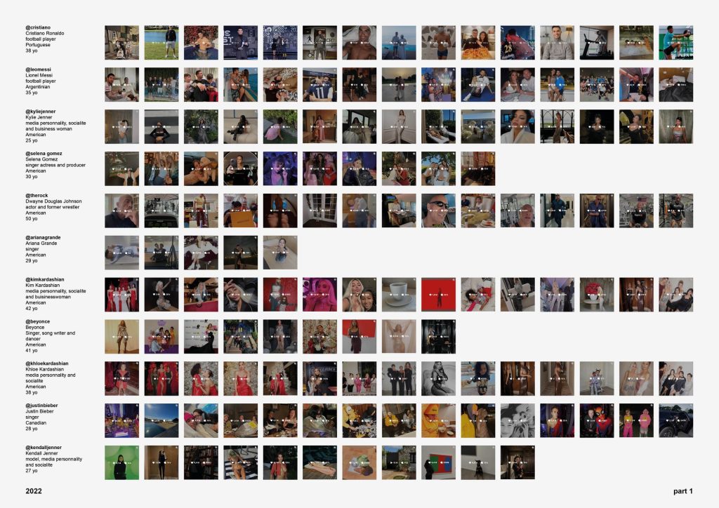 The analysis focuses on the 2022 posts from the top eleven Instagram accounts worldwide, excluding those with an explicit commercial purpose. It focuses on the representation of ‘staged everyday life’ or the supposed ‘behind-the-scenes’ of their professional lives portrayed in interior spaces. Instagram’s media features suggest that all information communicated on the platform is taken ‘on the go’ from the celebrity’s own phone, and shared personally by the account owner. The entire process of photo and video production is integrated into the app, allowing work on a single device, the smartphone. Users are sold the idea of democratic access to the initiation, production, and appreciation of these media cultures without any distinction. This has radically transformed social and urban experiences of photography and audiovisual production, eliminating the need for a photo studio, editing studio, printing room, gallery display, and magazines and books as necessary spaces or devices for the existence of these activities. However, this supposedly inclusive immateriality has made the networks a powerful capitalist center over the years, developing its own processes of social distinction. Instagram generates a hierarchy in the type of content that is most successful (number of likes, most followed accounts, collaborations with brands, etc.), in the type of body most valued (based on the eleven accounts considered, it remains predominantly heterosexual, American, white, and hypersexualized), and in its material environment exposed to public consumption. All of these are products of this immaterial market, infiltrated into households worldwide.