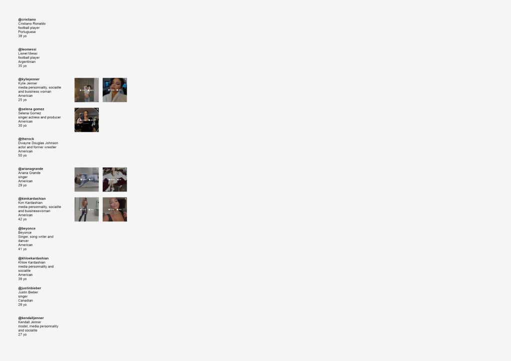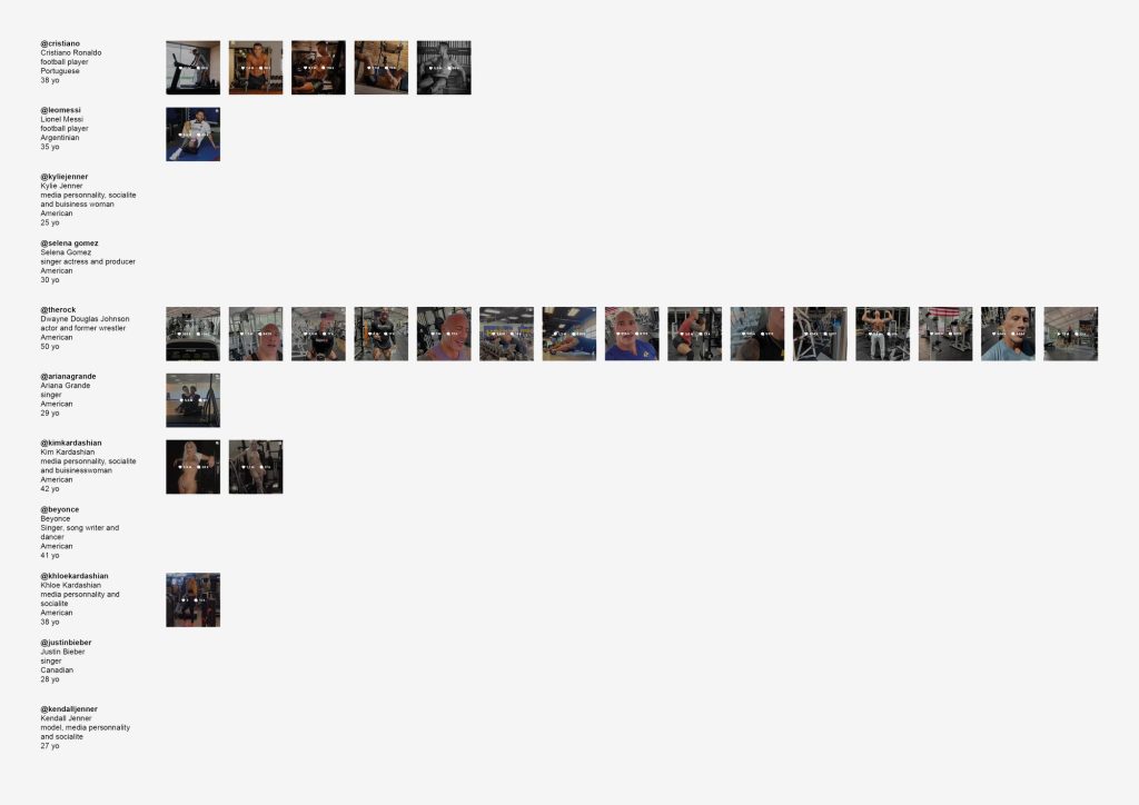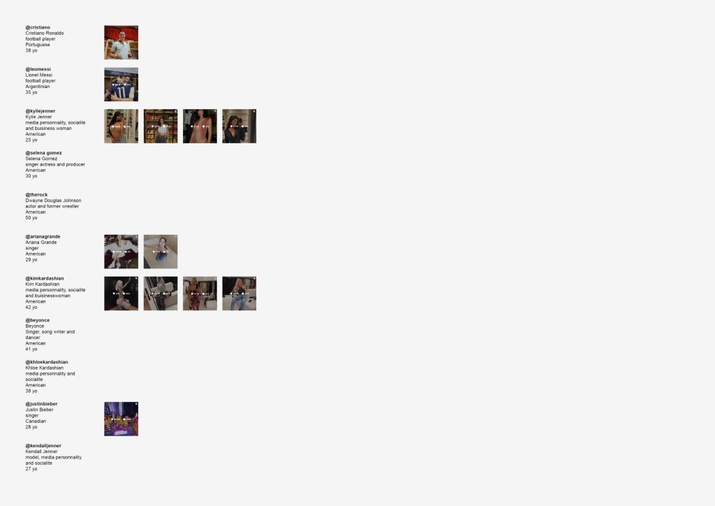 The eleven accounts analyzed present mediated bodies as the main object of their messages. Their representations are amplified, completed, modeled, and staged through a series of material devices that contribute to spreading an expanded definition of their executed bodily identity. Cosmetics, surgical implants, clothing, body prosthetics, gym machines, furniture, and interior spaces are the complements of this theatrical everyday life, and the eleven most followed individuals each possess at least one commercial brand for them. They understand that in order to construct their own public persona, it is apparently necessary to develop the spatial conditions of this narrated identity. To do this, they design their own bodies as the primary material object, the primordial space from which this identity is emitted. Utilizing Michel Foucault’s notion of utopian corporality, the material equipment they use “makes of this body a fragment of imaginary spaces,” a place where utopias crystallize, materialized in their flesh, with their own codes, hierarchies, and idealized models. Through their representation on social networks, bodies like those of the celebrities from the top eleven Instagram accounts become utopian, infinite spaces, distanced from their aged, rough, and imperfect liveliness, which can be analyzed as a unique architectural type of social media : an immaterial space that supports the construction of the public visual identity of its owners.