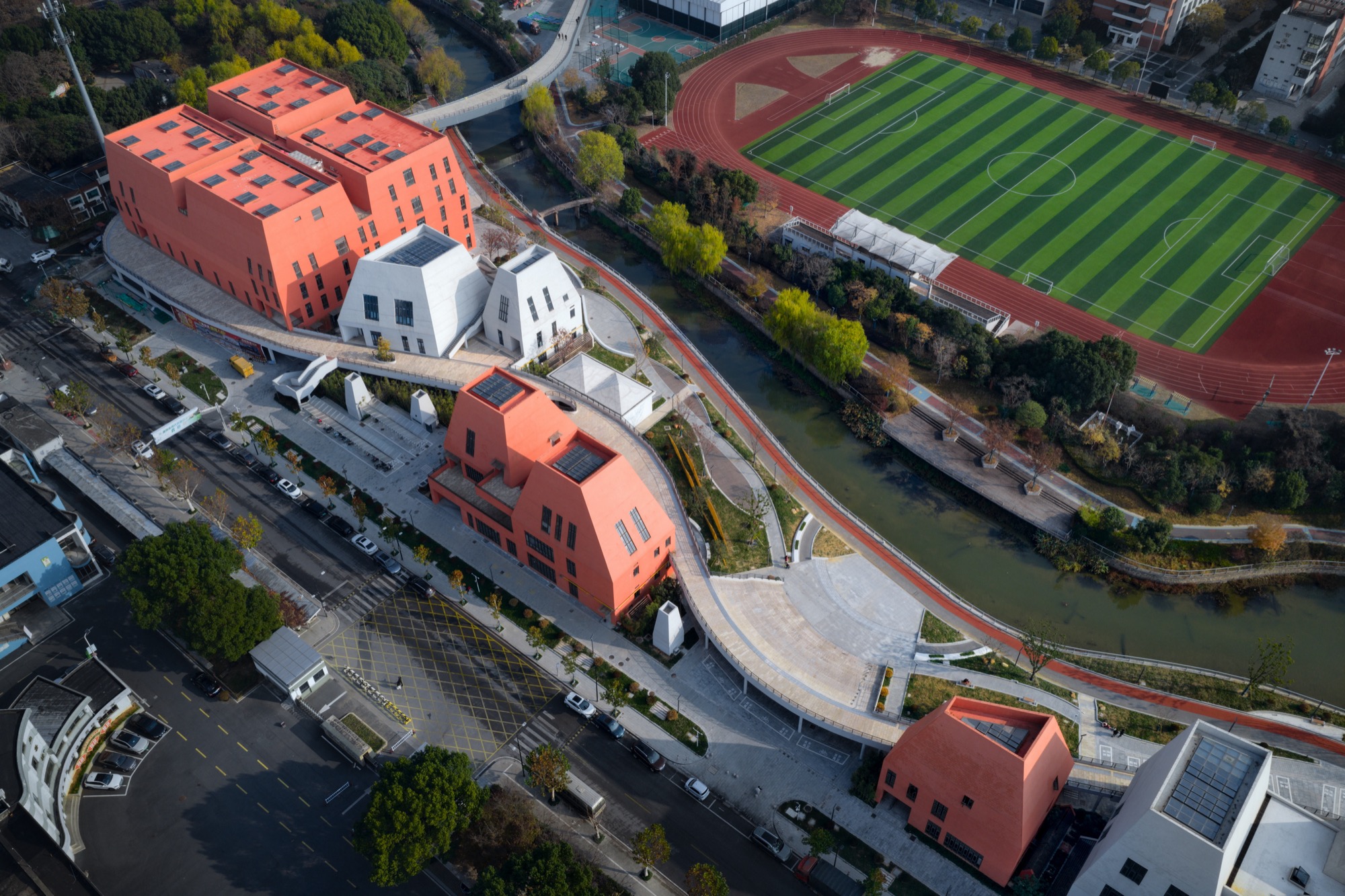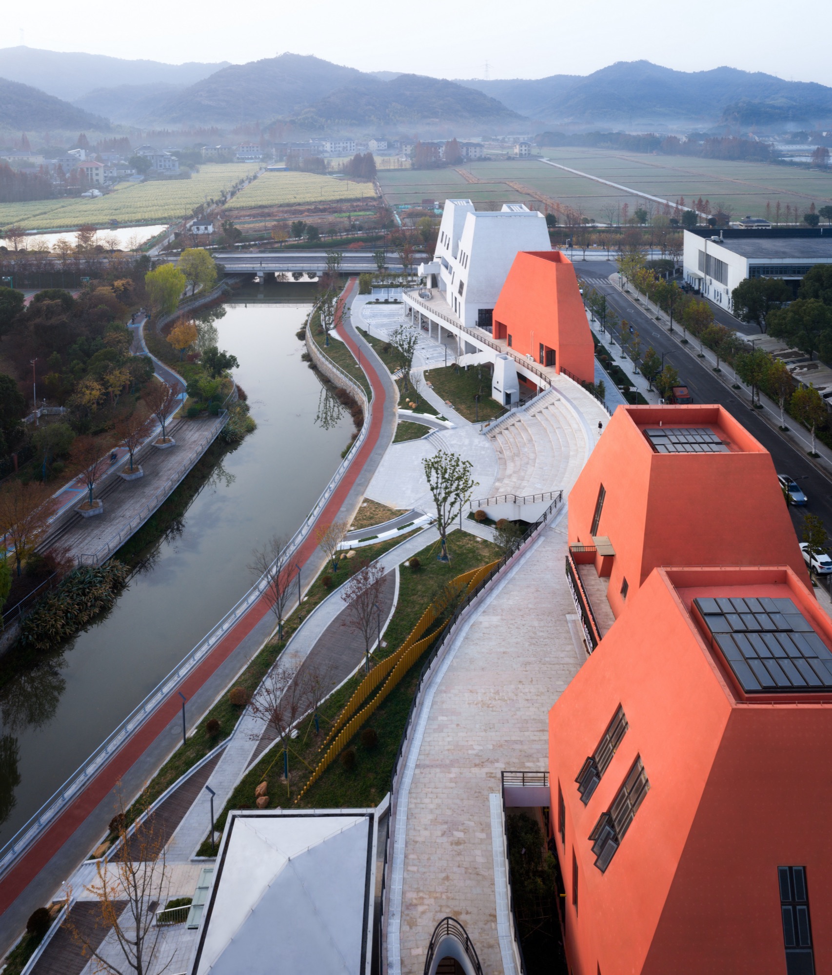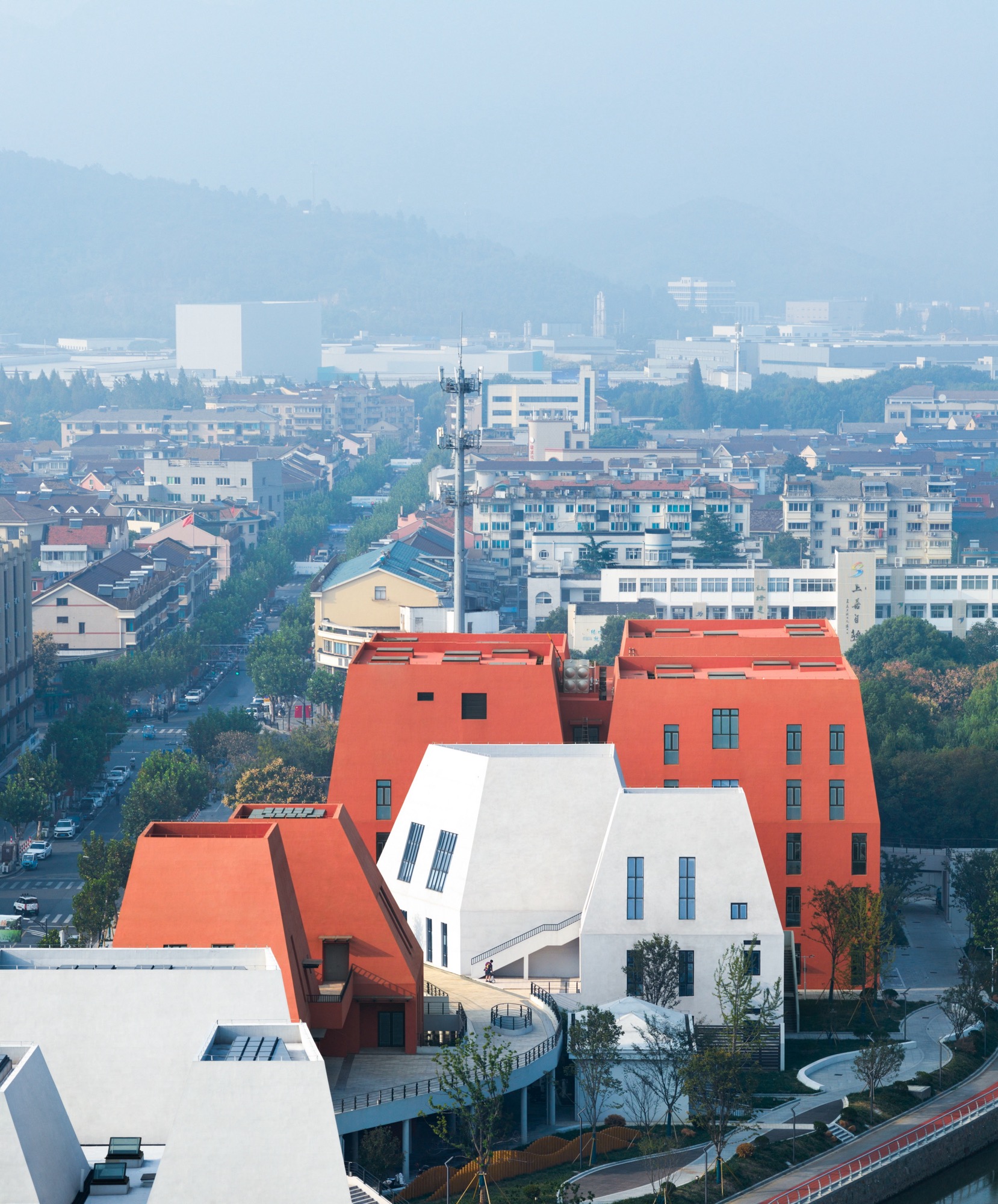 LZ: White references the traditional color palette of Jiangnan towns, where white walls and dark roofs have defined the visual identity of the region for centuries. Orange-red, by contrast, introduces a sense of unfamiliarity and signals the arrival of something new.