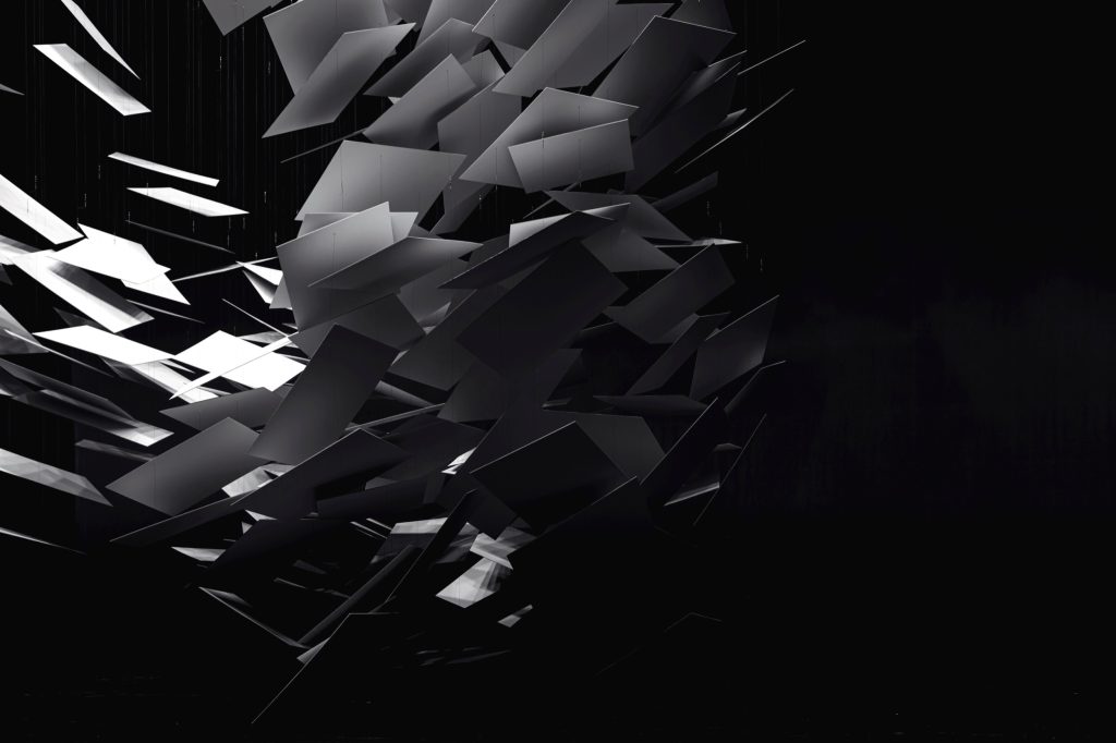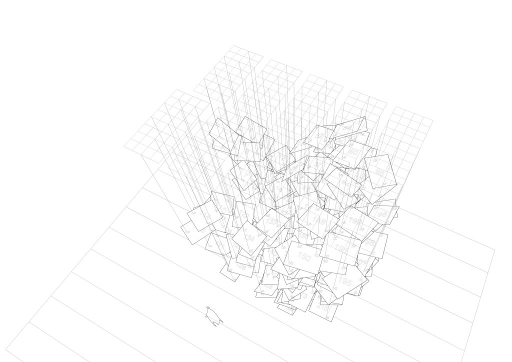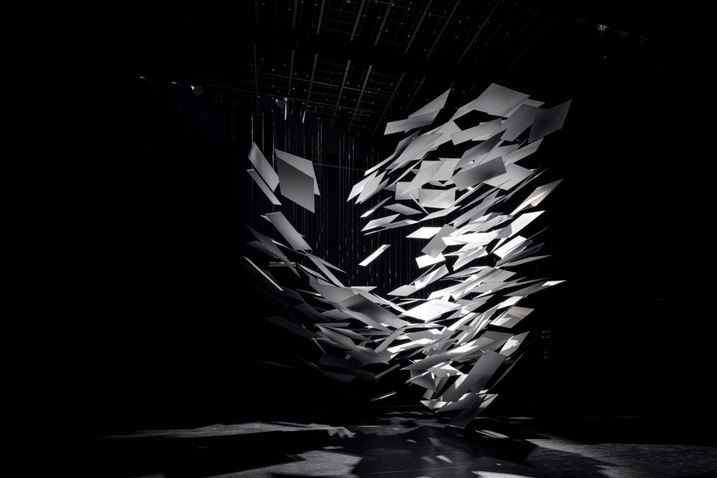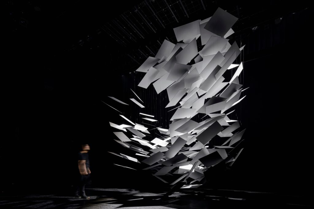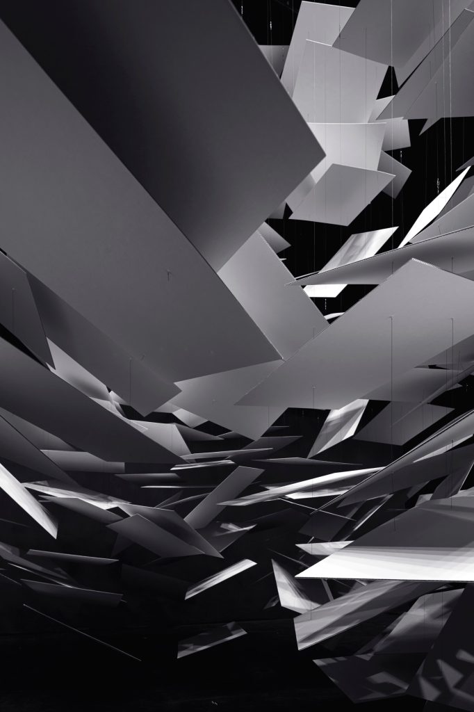 The object is made from hundreds of thin planes, tilted to catch light and cast layered shadows. As these shadows accumulate, darker pockets appear, suggesting mass and depth, so the cloud reads less as an object and more as a volume. Visitors are invited into the blankness around it, then compelled to look up and “face” the work as a singular being.