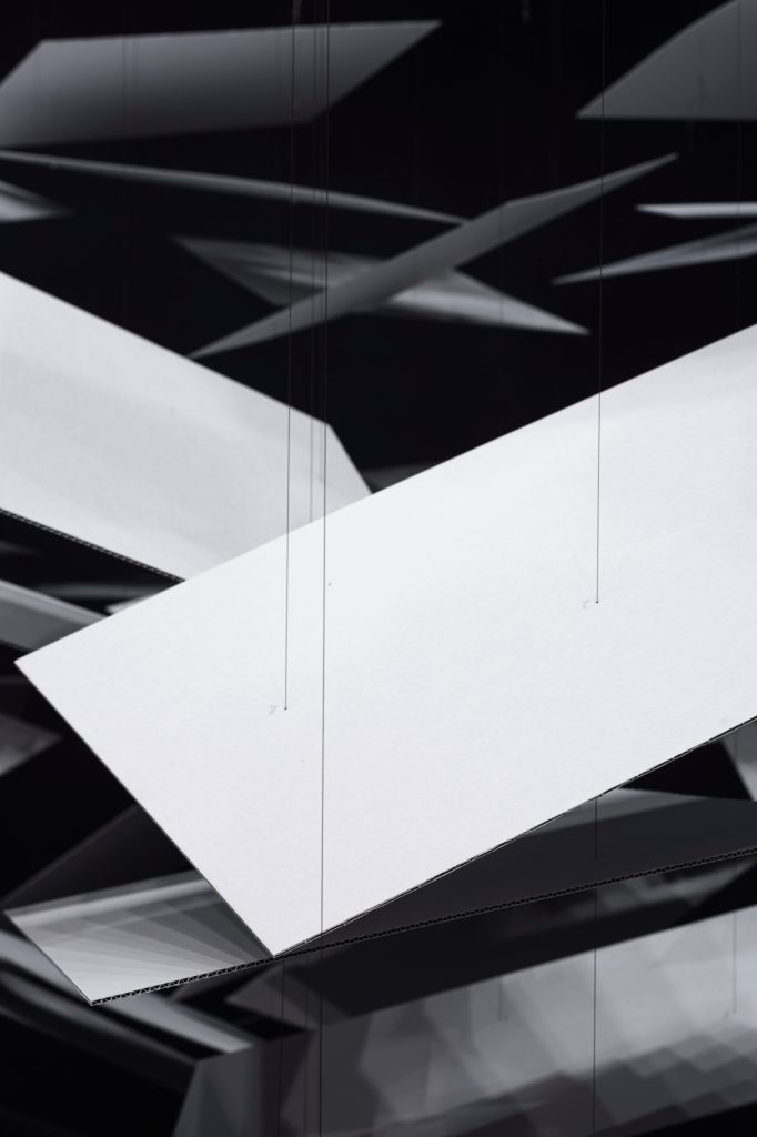 Material choices keep the effect light while staying robust. The planes are cut from reinforced corrugated archival board made from 100 percent virgin pulp, the same class of material used for durable art storage. Fine polyethylene fibre thread completes the illusion, making the cloud appear to hover rather than hang.