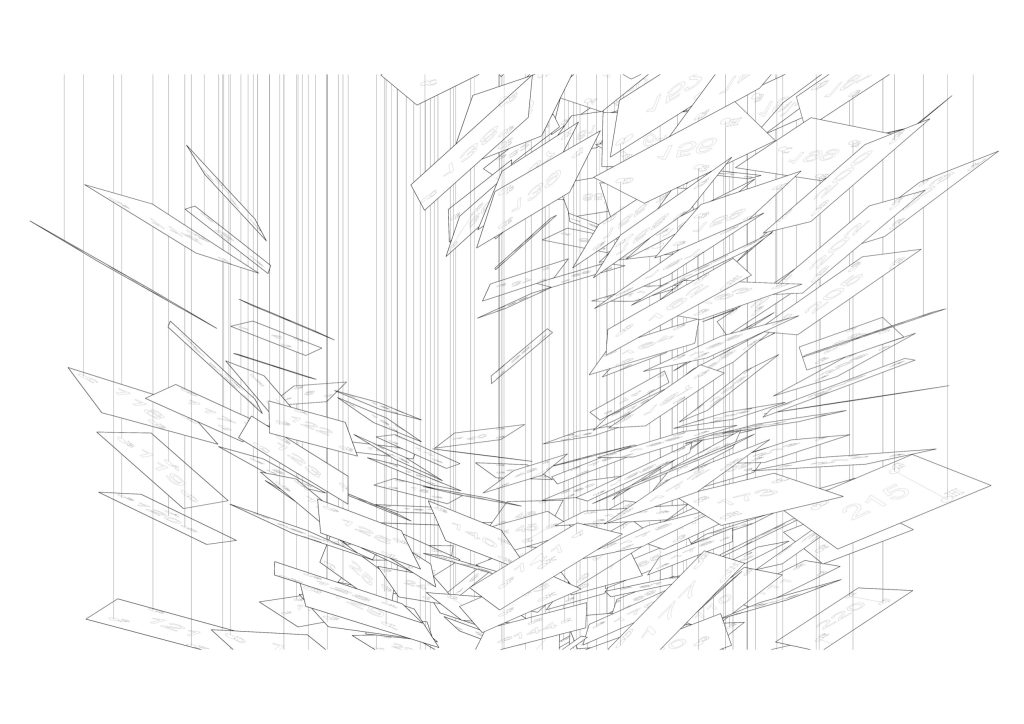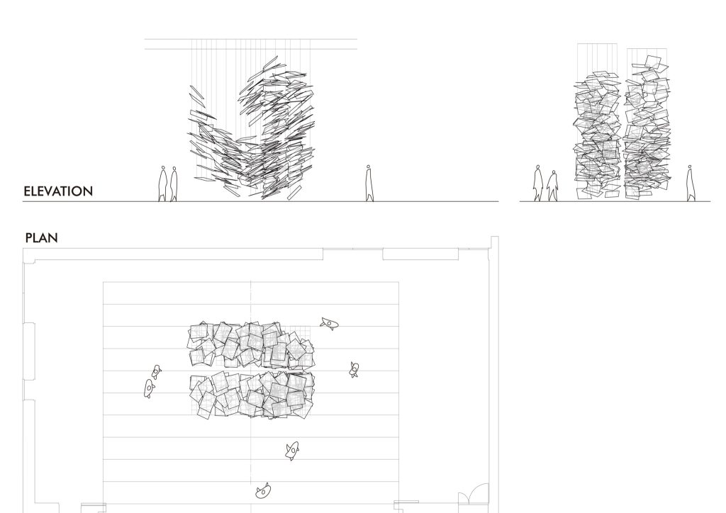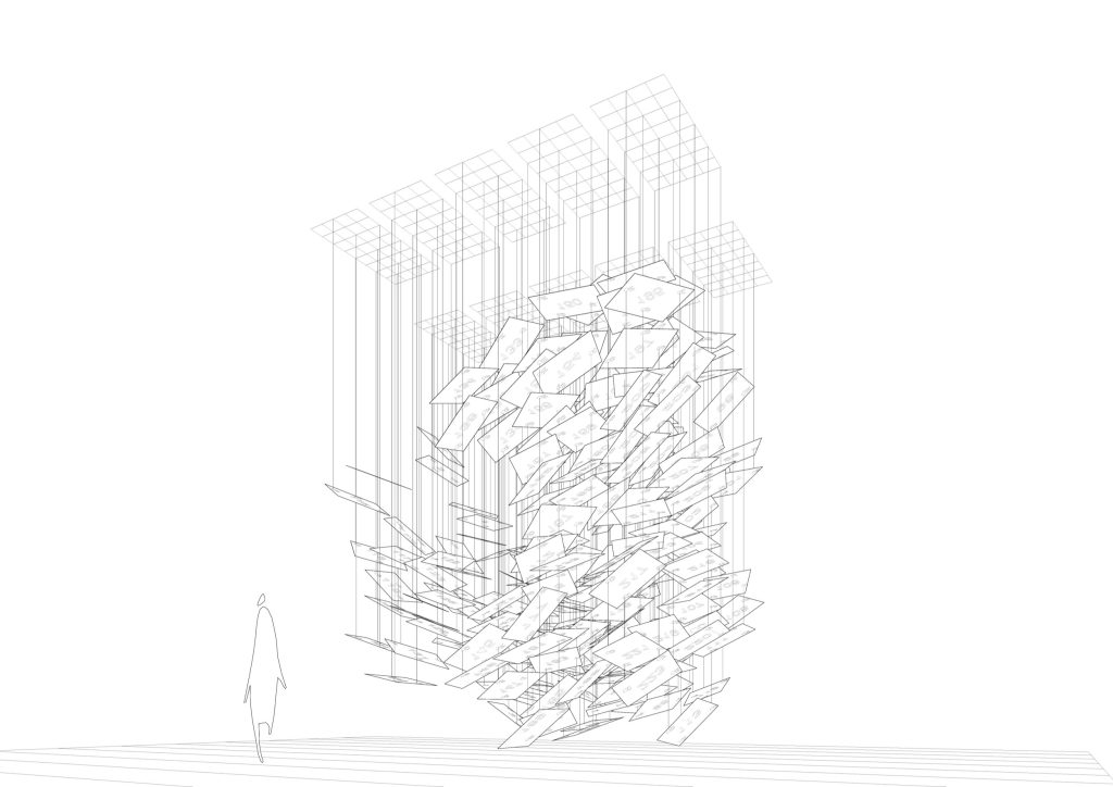 Each plane is drawn and positioned in 3D space, then tuned through computational design to achieve both structural balance and visual irregularity. The suspension system is equally precise: ten steel mesh grid panels, each 800 by 1600 millimetres, are fixed to the ceiling, with fine threads dropping along the grid to support each 3 millimetre thick board at three points.