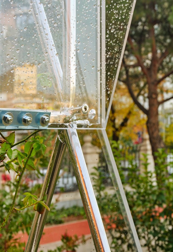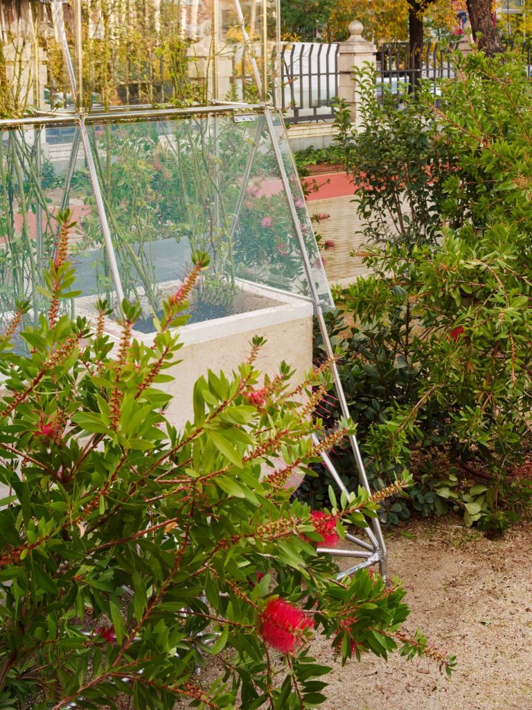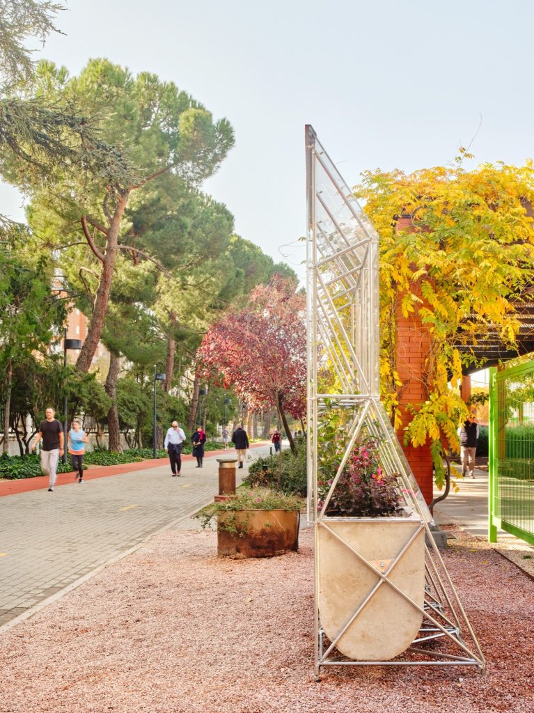 To hold the images, the project introduces metal frames shaped by the roof condition they occupy. Their silhouette references the fencing along the rooftop of the Colegio Maravillas by Alejandro de la Sota, translating an iconic piece of Madrid modernism into a new civic apparatus. Wrapped in transparent methacrylate, these structures operate like transportable greenhouses or Wardian cases, controlled environments capable of hosting delicate plant species alongside the images.