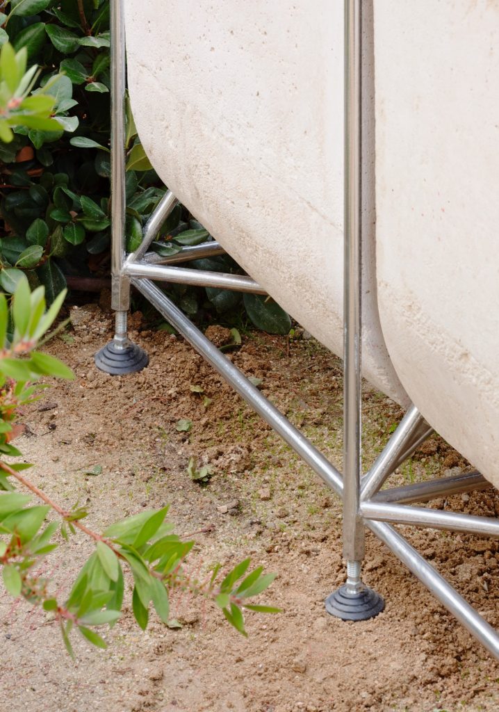 Stability comes from below. A modular base of prefabricated concrete planters provides substrate for roots and reserves for water, while adding the mass needed to anchor the assembly. The result is a system that can be moved and re-sited without losing its architectural coherence, combining portability with the calm assurance of something meant to last longer than a campaign.