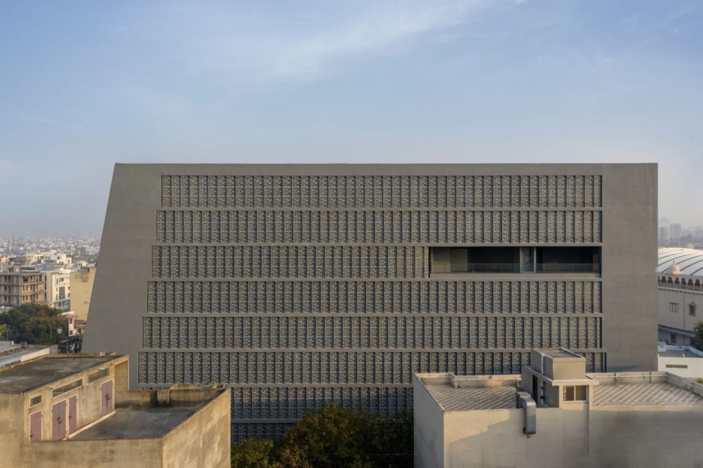 A defining feature of the project is the envelope that wraps the building’s lateral facades. Inspired by the traditional stone jaali screens widely found in Rajasthan’s historic architecture, the project reinterprets this element through contemporary materials and construction techniques.