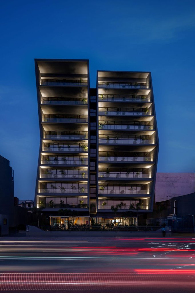Facing the main road on the western side, the building adopts a distinctive volumetric strategy. The facade inclines both forward and backward, generating two vertically articulated masses with opposing angles.