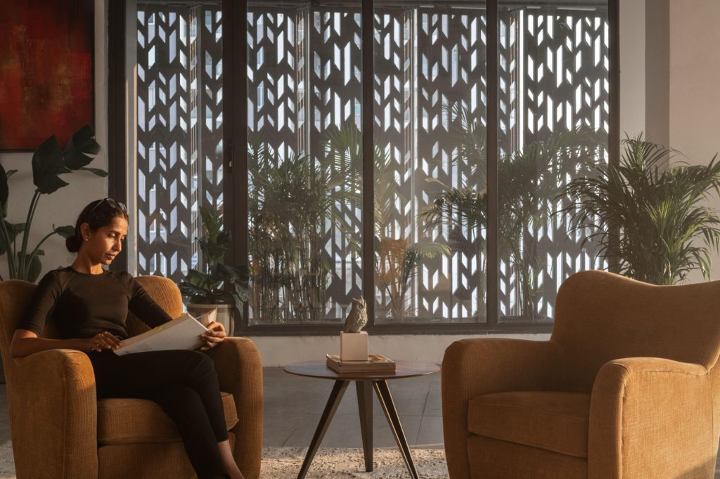 Beyond their environmental performance, the screens act as a climatic filter. By mediating sunlight before it reaches the glazed facade, the jaali-inspired layer softens solar exposure and contributes to a cooler interior environment.