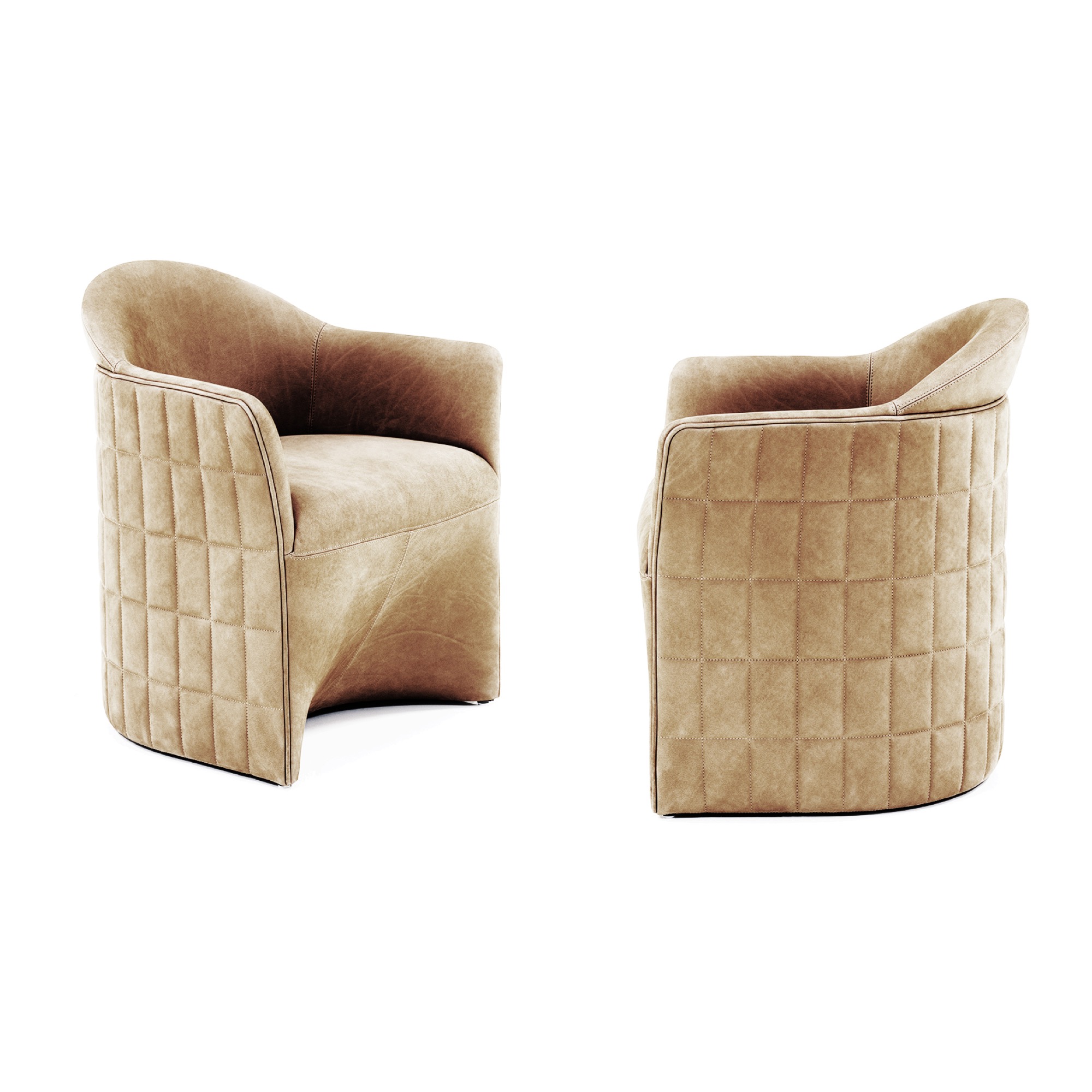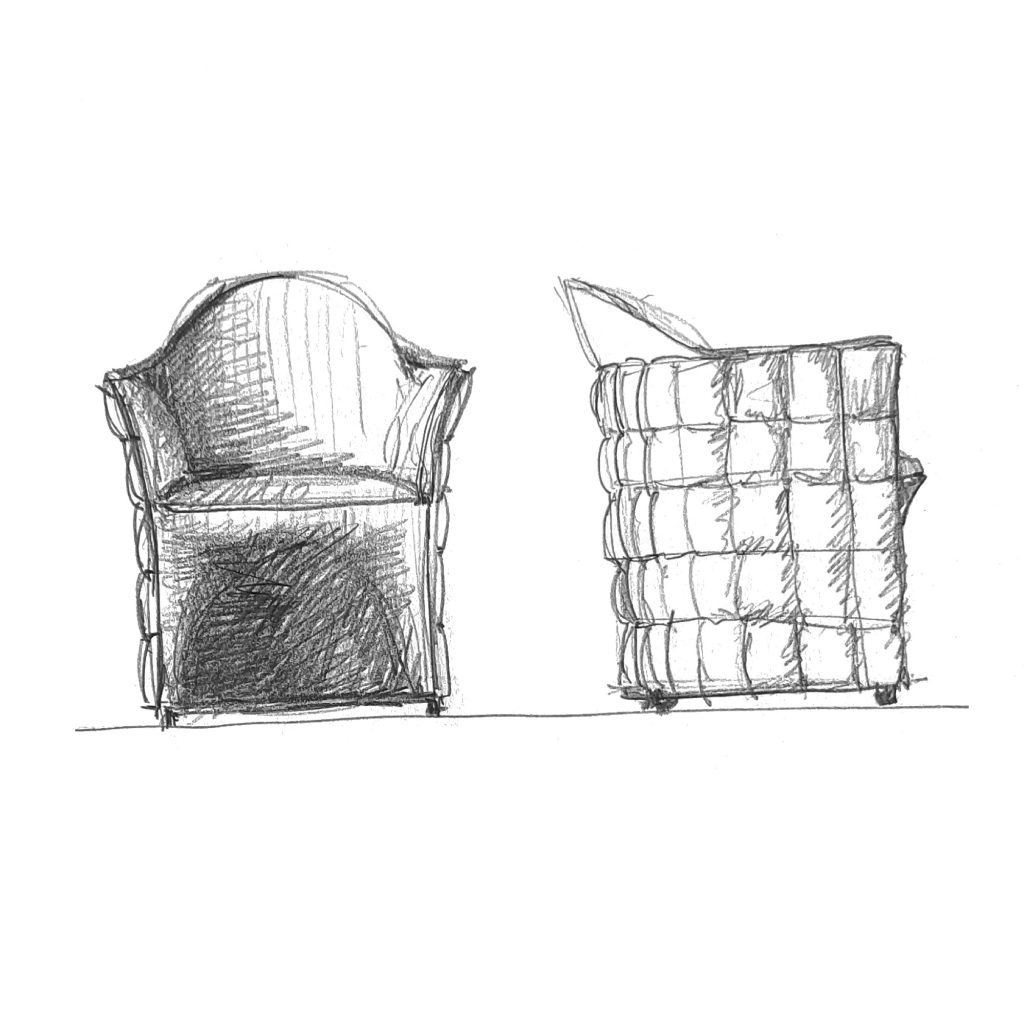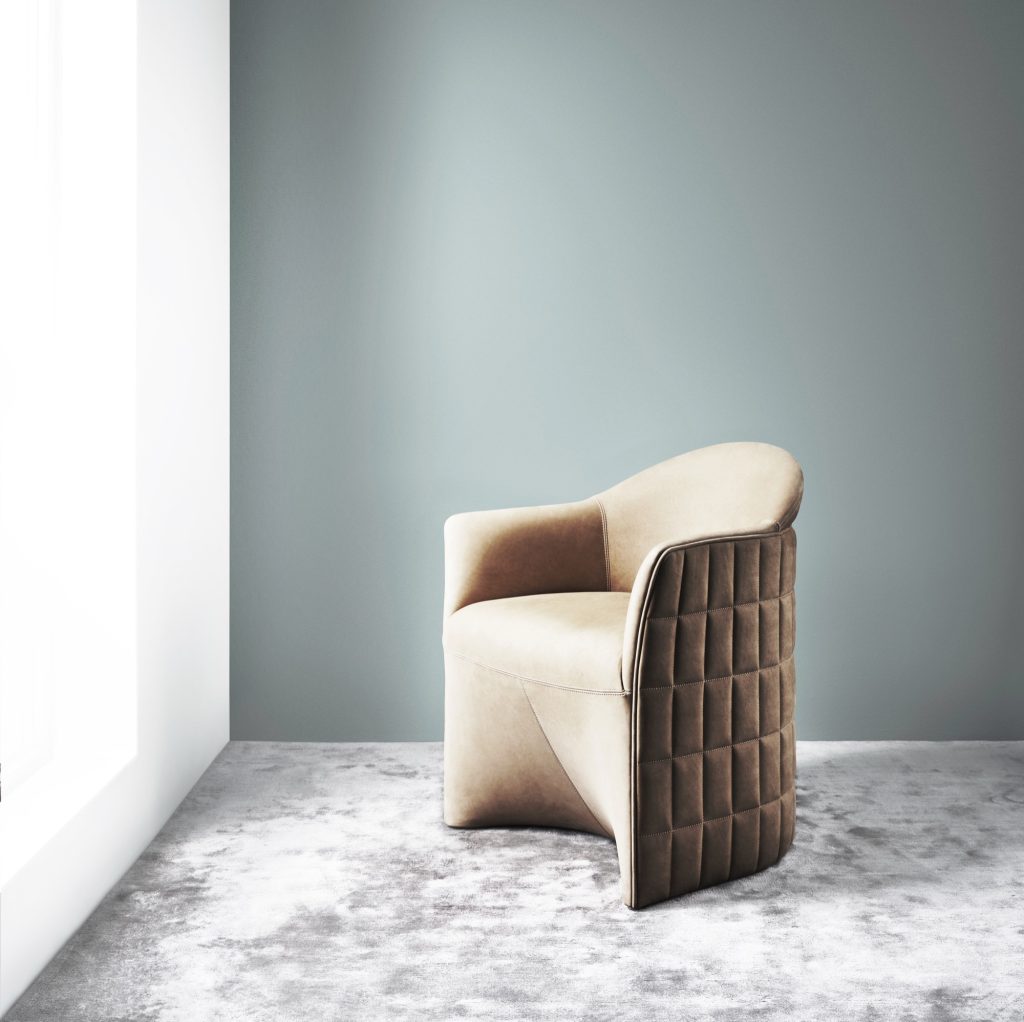 Rather than repeating the deep buttoning or quilted finishes traditionally associated with club chairs, JOSEPH establishes a dialogue between heritage and reduction. A soft, smooth seat and backrest are enclosed within a structured upholstered shell that extends to form the armrests. This outer layer is defined by a precise gridded quilting, referencing the ornamental language of the Secession movement while setting the proportions of the piece.