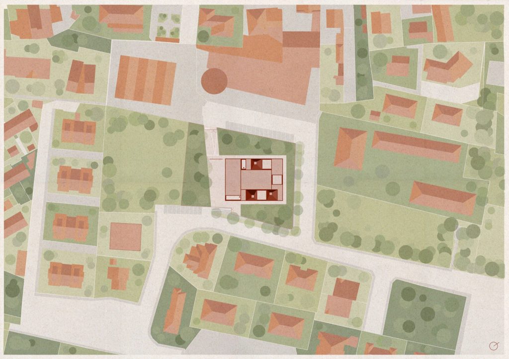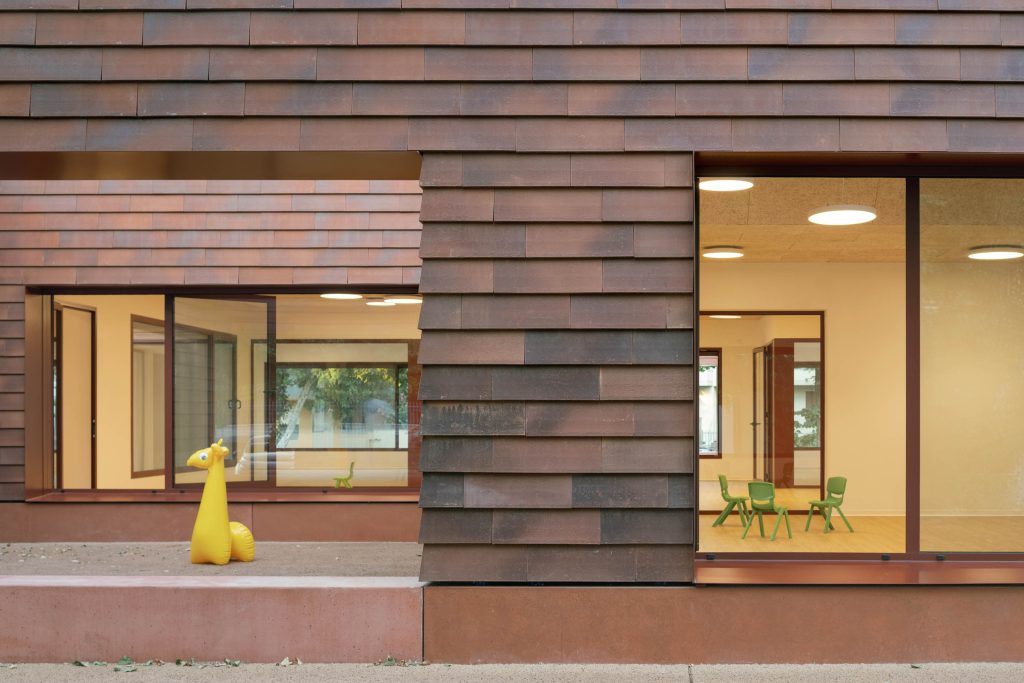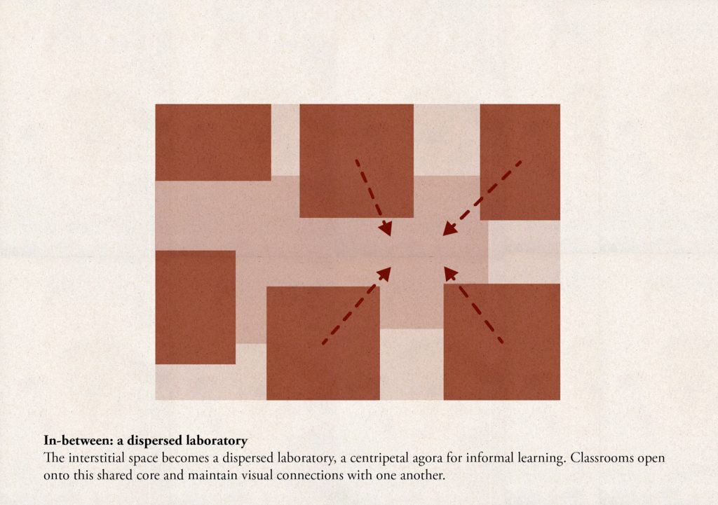 At the same time, the classrooms face inward, engaging with a central agorà. This shared space acts as the social heart of the kindergarten, a place for collective play, informal learning, and daily encounters. Like houses gathered around a village square, the architecture fosters a sense of community and belonging from the earliest years.