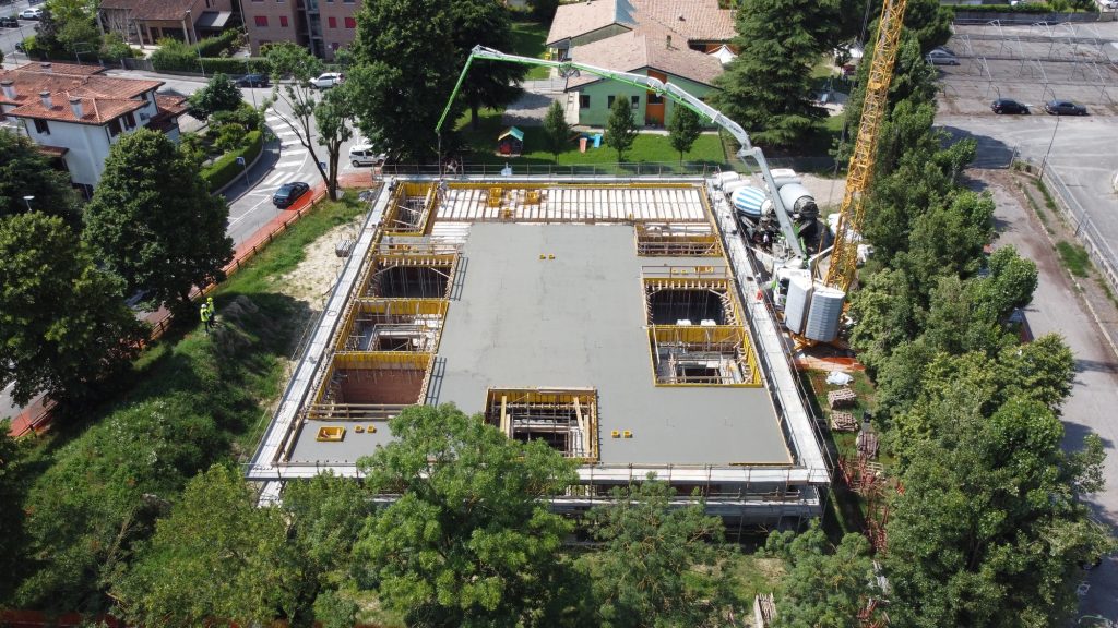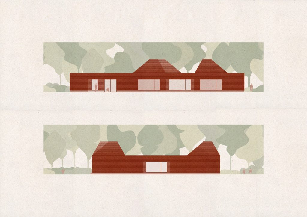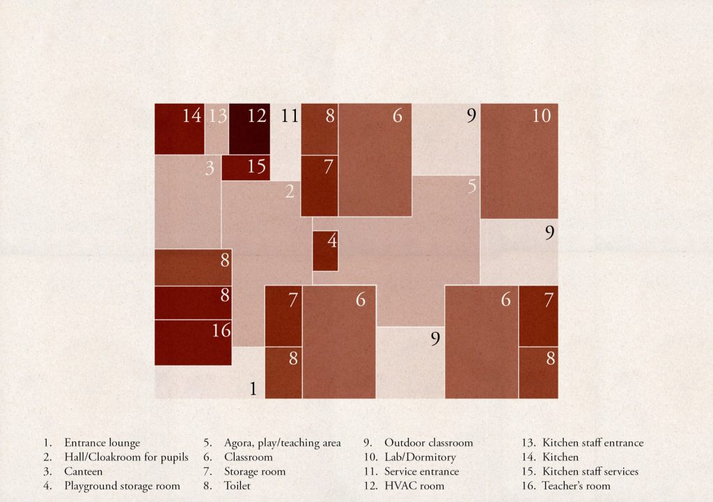 Three classrooms are expressed as volumetric exceptions within a continuous terracotta envelope. Their pyramidal profiles punctuate the overall composition, evoking the age old tradition of clay construction and sloped tile roofs typical of the Veneto countryside. The terracotta skin becomes both a unifying surface and a tactile narrative, anchoring the project to local building culture while giving it a strong, iconic identity.