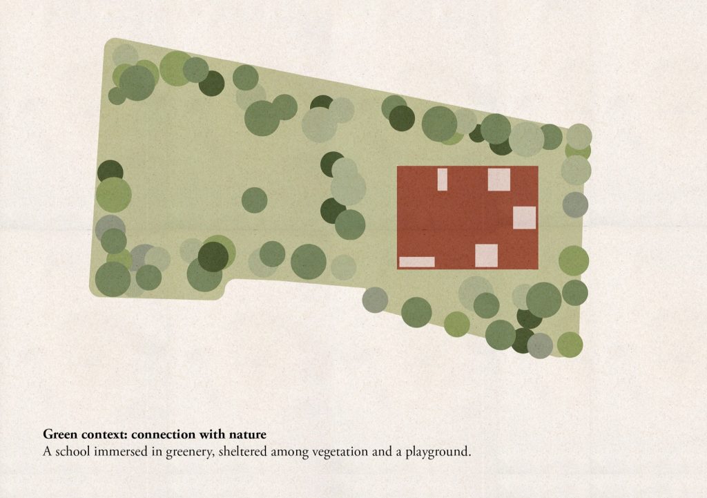 At ground level, a soft pigmented concrete bench gently meets the soil. This element acts simultaneously as urban furniture, a playful edge, and a threshold between different worlds. It mediates between the didactic and the spontaneous, between interior and exterior, encouraging informal play and lingering moments that extend learning beyond the classroom.