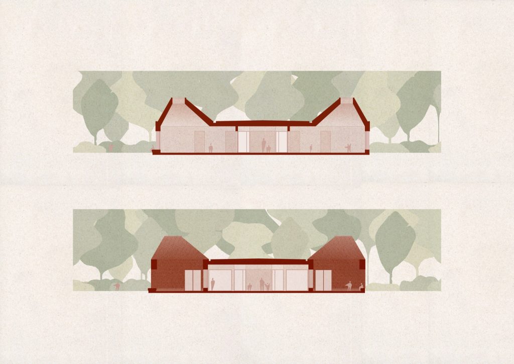 Kinder Rain is conceived as a primordial kindergarten shaped by the spirit of its place and by the emotional world of the child. It is a space that feels protected yet open to imagination, safe while remaining porous to wonder. Rather than a single building, the school unfolds as a small village, an abstract constellation of pyramidal volumes connected by open courtyards. Rising among trees and immersed in greenery, the vermilion architecture offers warmth and familiarity, immediately readable at a child’s scale.