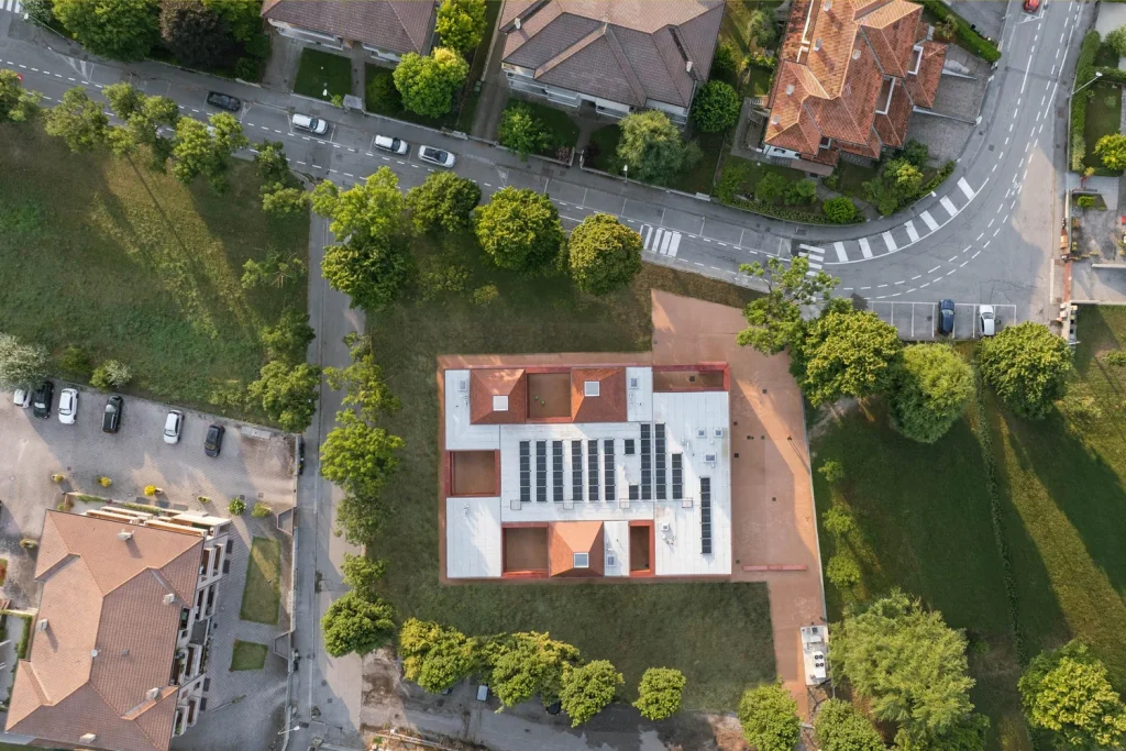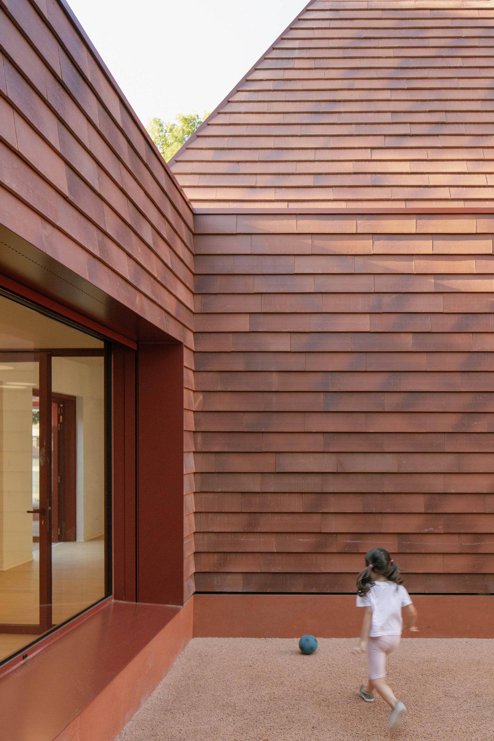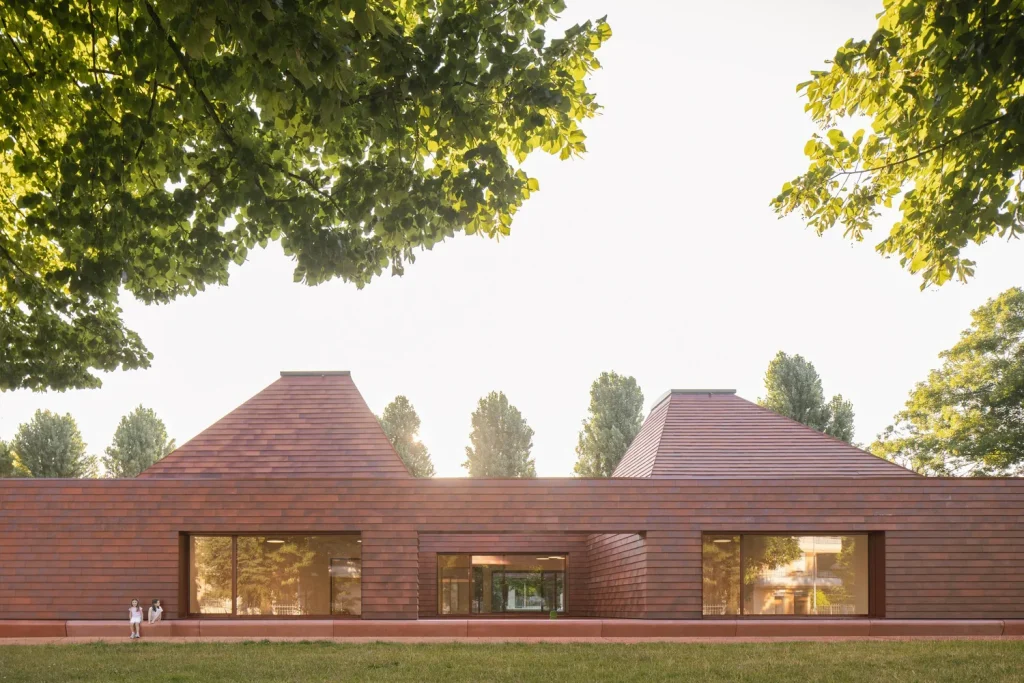 Rodolfo Morandi: Terracotta was chosen as a material deeply connected to local building traditions, particularly the use of shingle roofs. Our intention was not to replicate tradition, but to reinterpret it through a contemporary lens. The terracotta envelope gives the building a vibrant, tactile surface rather than a flat facade, one that responds to light and changing weather conditions.
