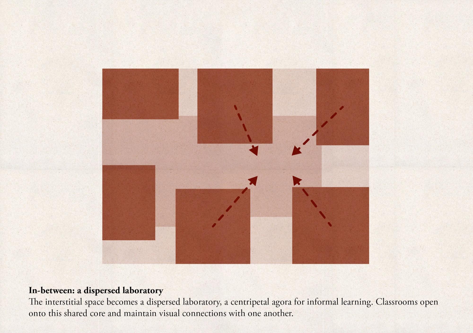 The central agora acts as a shared in-between space positioned among the classrooms and facing the courtyards. From this central square, the only visible windows are those opening toward the courtyards, with the garden beyond them. This layering creates a spectrum of spatial conditions, never fully enclosed and never completely exposed, allowing children to feel both connected and free to retreat when needed.