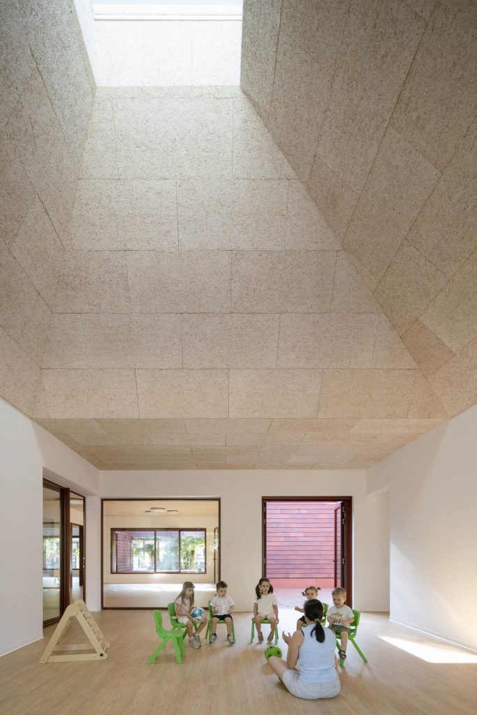 The pitched roof also creates a more enveloping spatial experience. Rather than a flat ceiling, the architecture surrounds the child and opens upward to the sky. Light enters from above, allowing the passage of time and seasons to be perceived, which is an essential dimension of spatial rhythm and awareness.