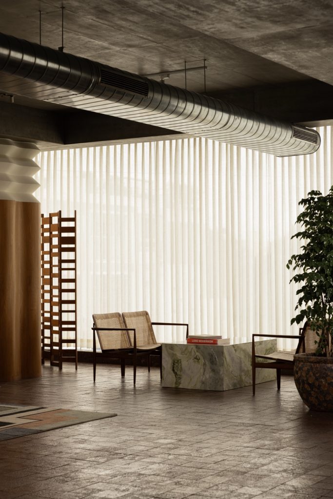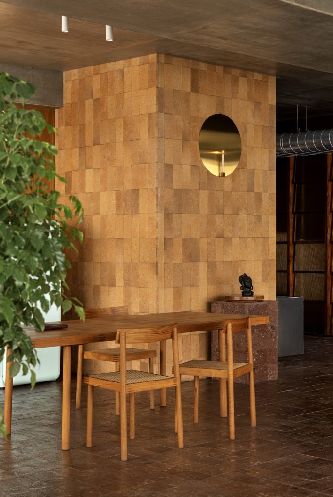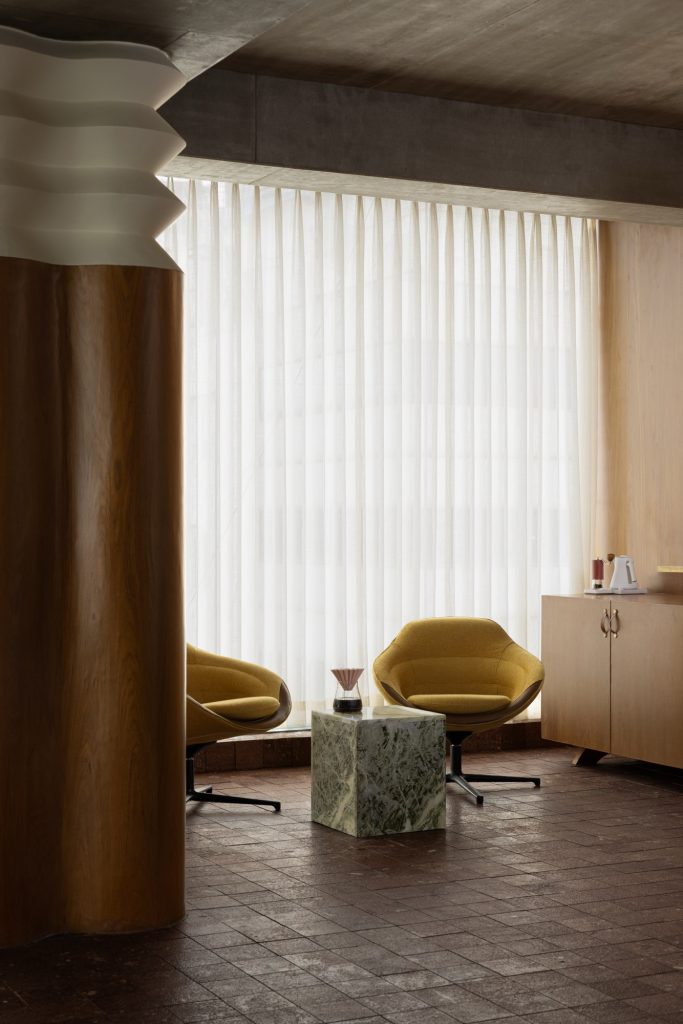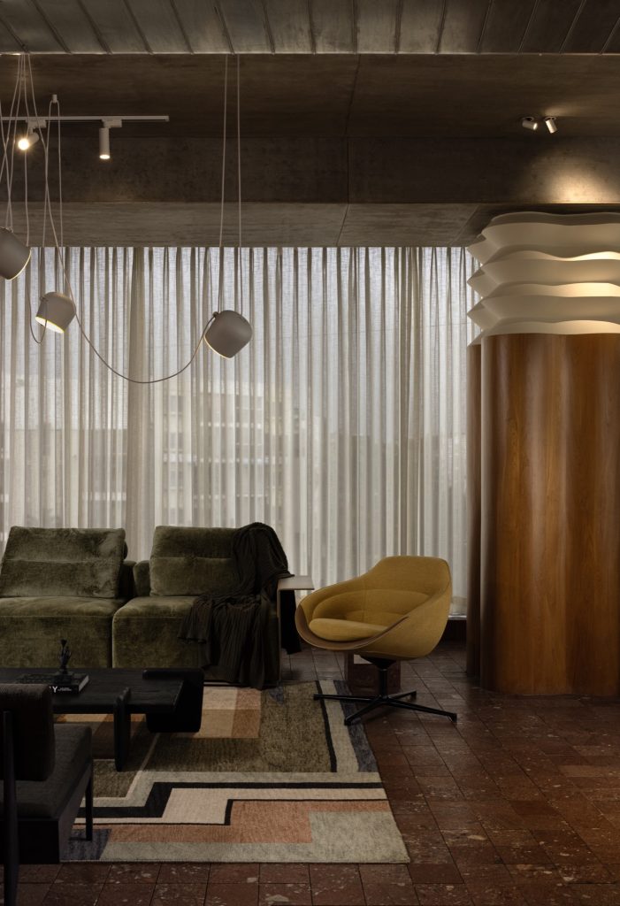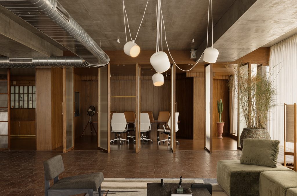 This solidity is balanced by the warmth of wood surfaces that wrap walls, partitions, and built in elements throughout the office. The interplay between concrete and timber produces a tactile dialogue between heaviness and softness, structure and craft.