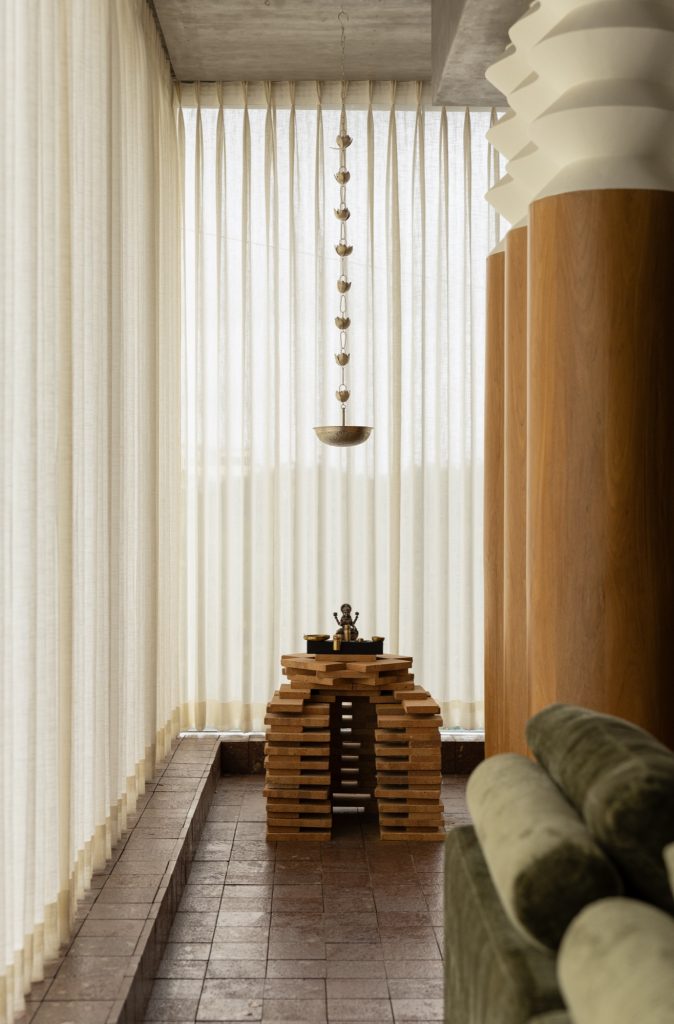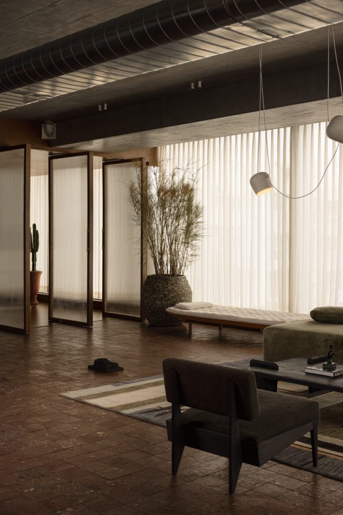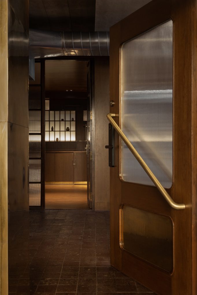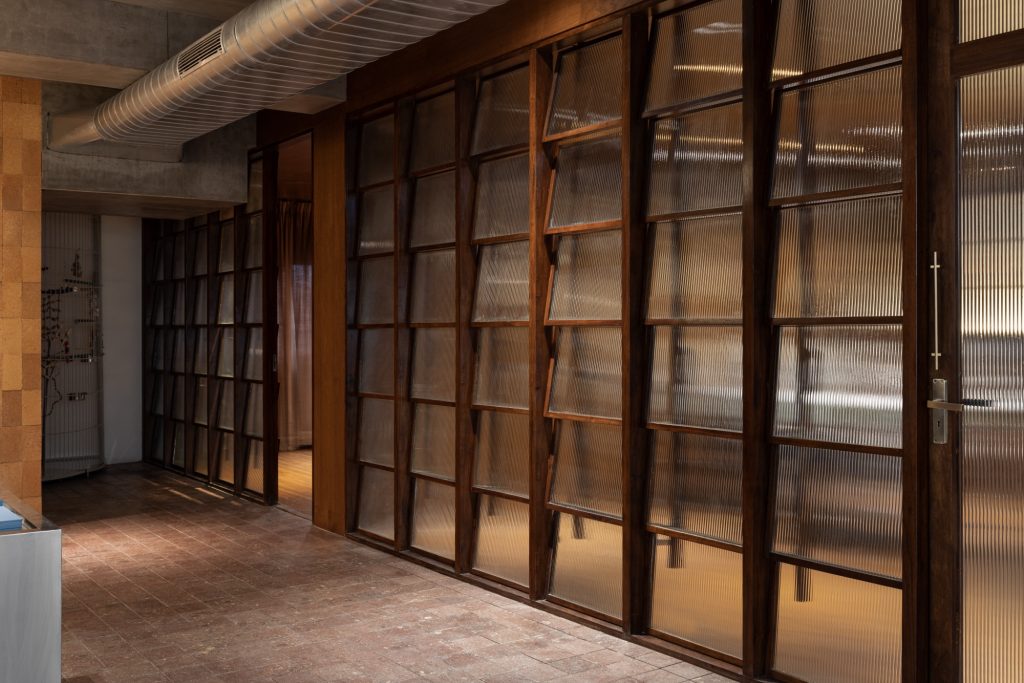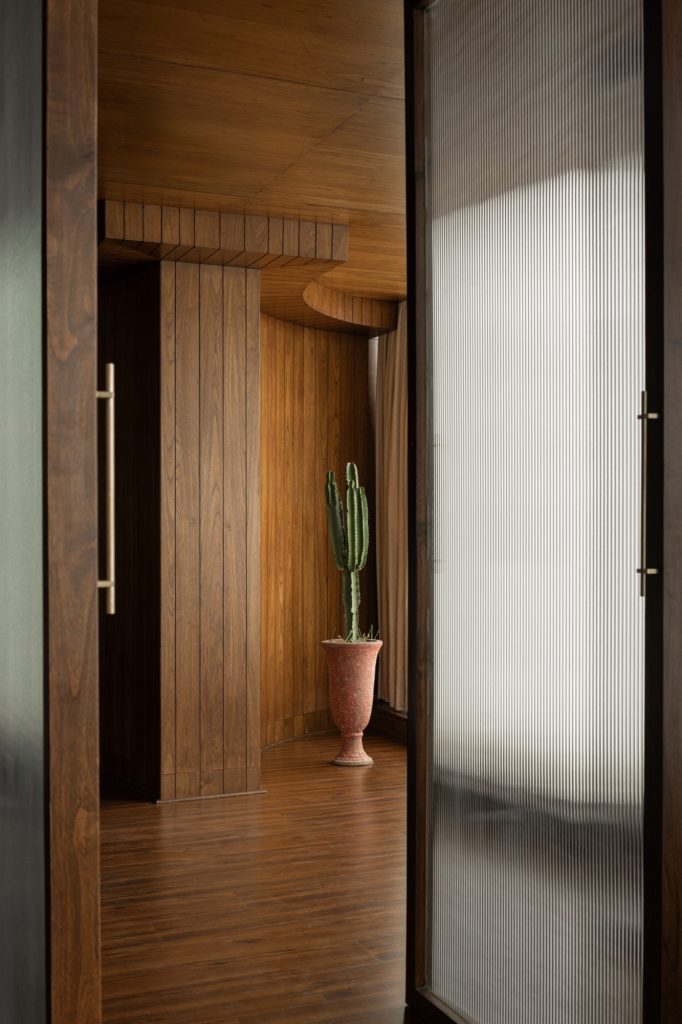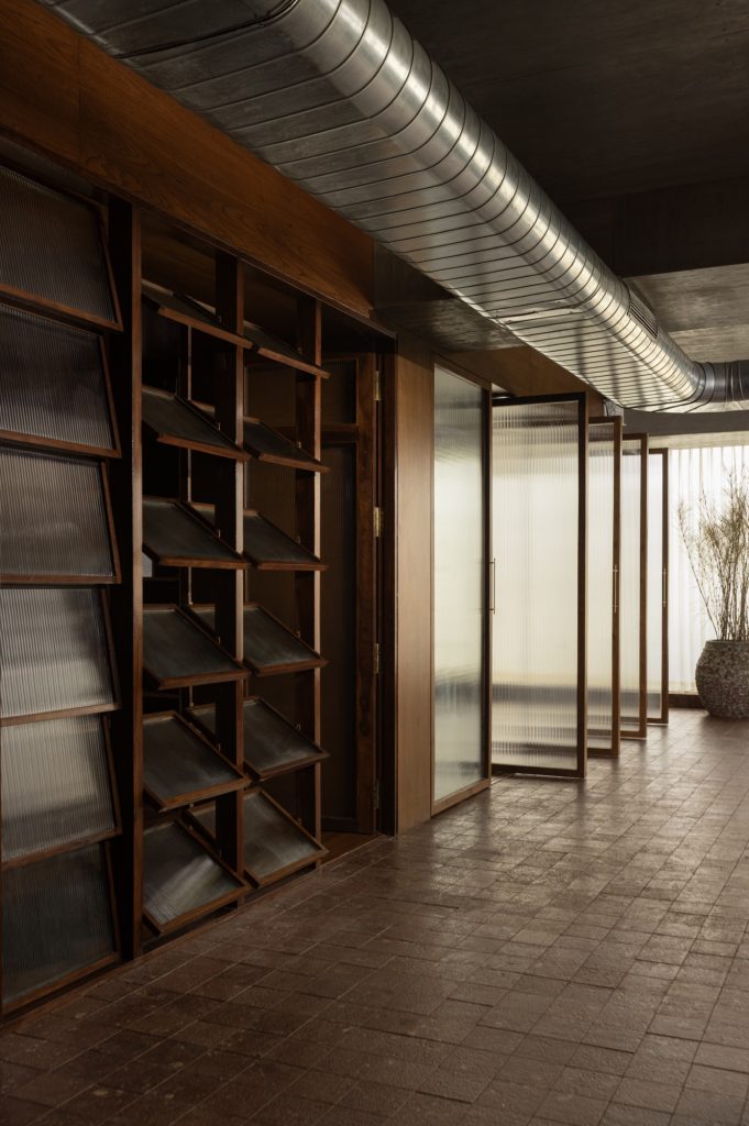 Glass surfaces with ribbed and fluted textures appear repeatedly across the project. These translucent thresholds filter light while maintaining visual continuity between zones. Instead of functioning as barriers, they operate as atmospheric membranes that blur spatial boundaries while preserving a sense of openness.