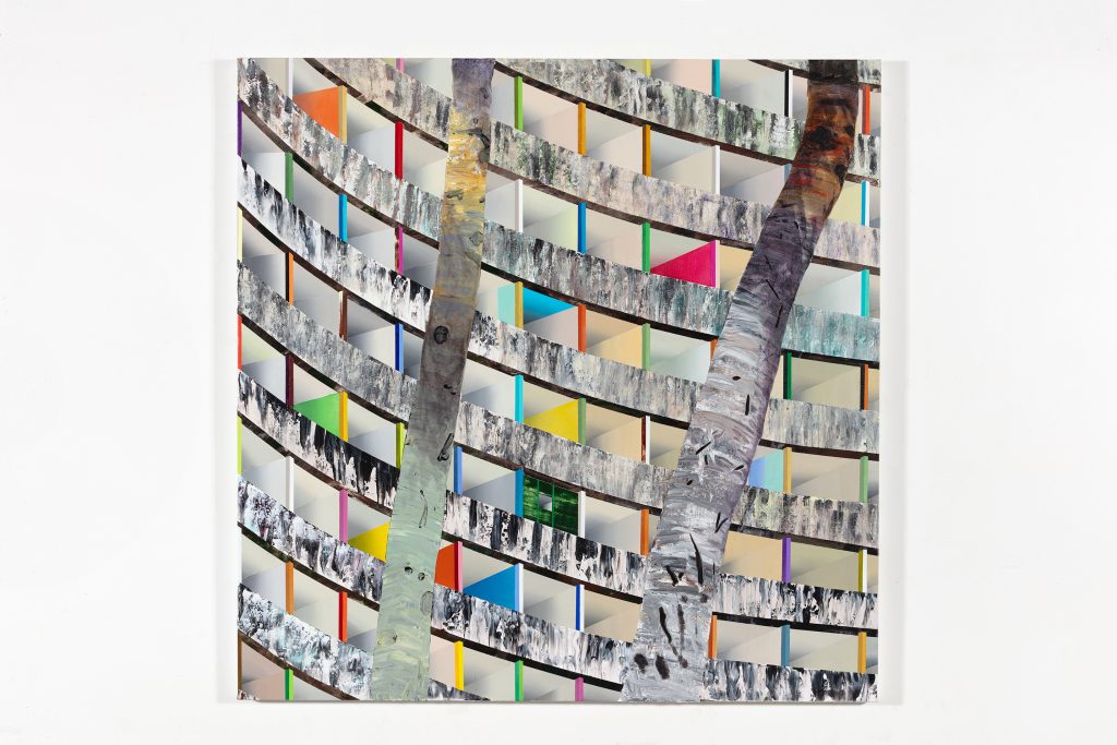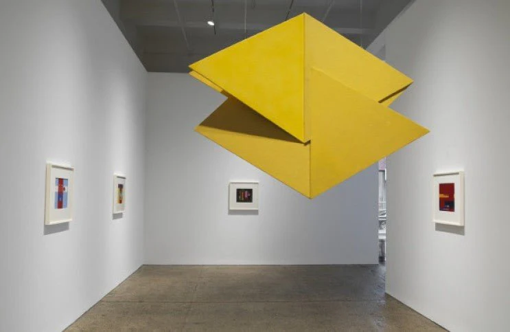 Marina Perez Simão’s abstract painting installed in a polychrome room at ABERTO4, symbolizing the fusion of Brazilian art and modernist space. Credit: ArchDaily / Thomas Lannes.