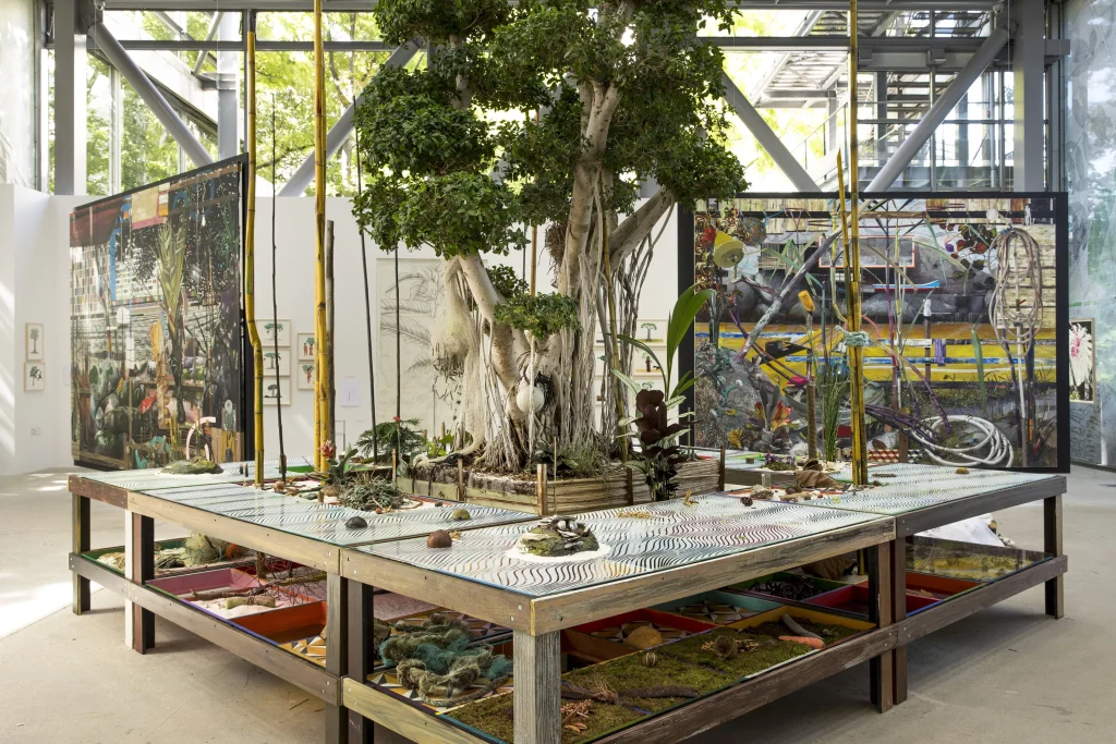 Contemporary works introduced a distinct register. Beatriz Milhazes engaged the villa’s chromatic calibration through layered abstraction that oscillated between geometry and ornament. Luiz Zerbini presented imagery of architectural erosion and vegetal encroachment, subtly destabilising the clarity of the modernist envelope. Marina Perez Simão and Liuba Wolf explored scale and material density, allowing the building’s volumes to register as spatially active rather than static.