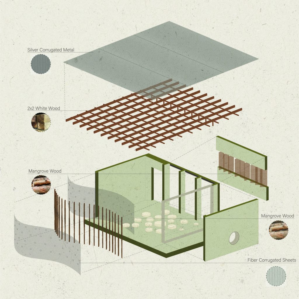 A timber structural system defines the project’s constructive logic. Exposed framing expresses material clarity and ease of assembly, aligning with familiar local building methods. The envelope is composed of perforated corrugated panels that temper daylight while facilitating continuous airflow. As sunlight shifts across the surface, the interior atmosphere transforms throughout the day, producing a dynamic yet gentle spatial experience.