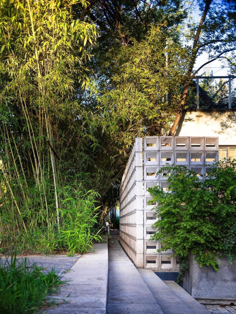 A perforated concrete block screen lines the lower facade, filtering views between interior and terrace while casting shifting shadows throughout the day. The language is industrial yet tactile, calibrated to balance precision with patina.