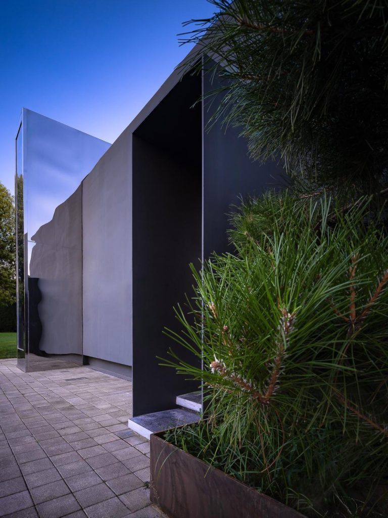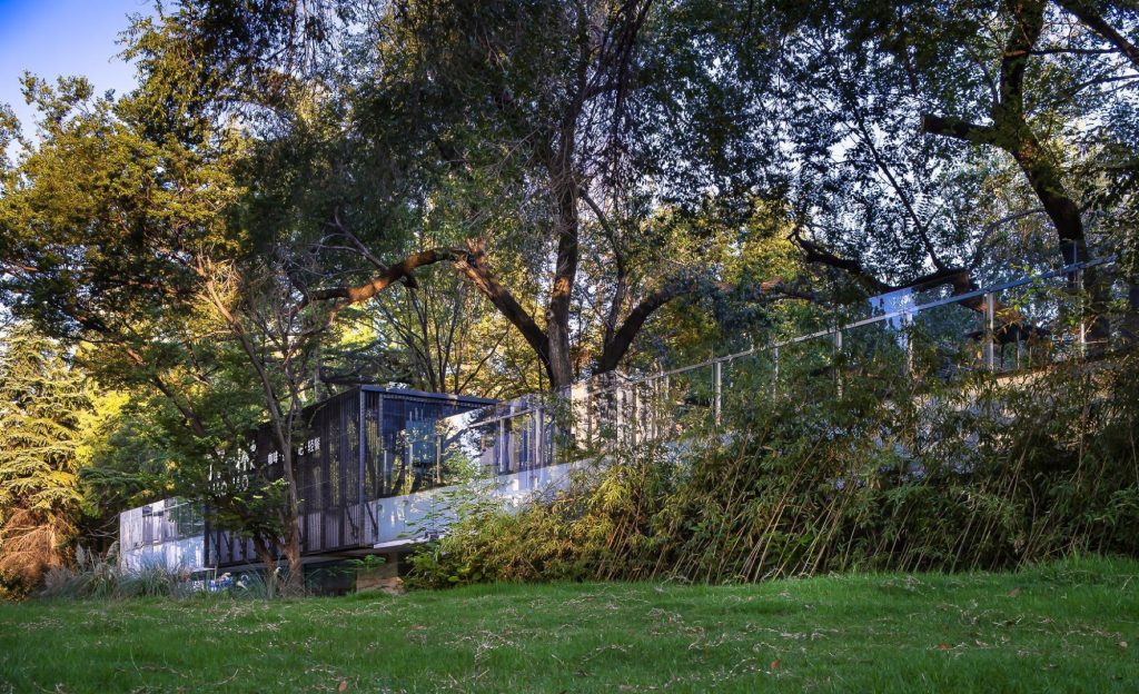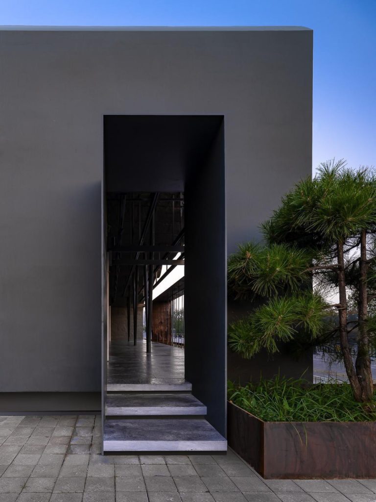 Material contrast underpins the project’s dialogue with context. A mirror finish stainless steel volume anchors one end of the building, reflecting trees, sky and passing visitors so that its edges dissolve into the parkland. Along the main body, weathered Corten steel panels introduce a deeper chromatic register. Their oxidised surfaces suggest sediment and time, subtly resonating with the Bronze Age and Tang dynasty artefacts housed next door.