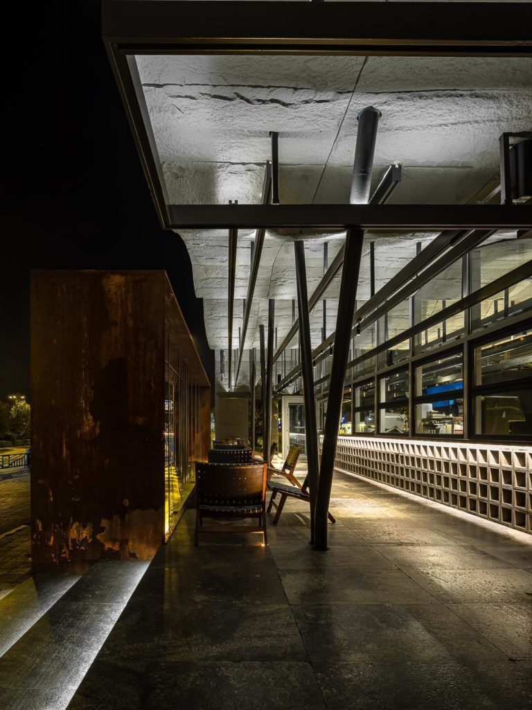 Exposed steel columns branch upward beneath the canopy, supporting the roof at varied angles. Their configuration recalls the trunks and limbs of the mature trees that populate the museum grounds. Structure is not concealed but celebrated, lending the pavilion a workshop clarity that aligns with the craft of specialty coffee. The underside of the roof remains raw concrete, its textured soffit catching light from linear fixtures mounted along the beams. This deliberate restraint foregrounds material authenticity and avoids visual excess, allowing light and shadow to animate the interior.