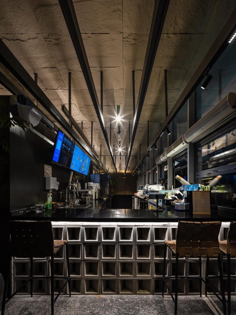 At the centre of the plan, a long service bar constructed from the same concrete block used outside reinforces material continuity. The open preparation area invites guests to observe the craft process, positioning the cafe as both social condenser and performative workspace.