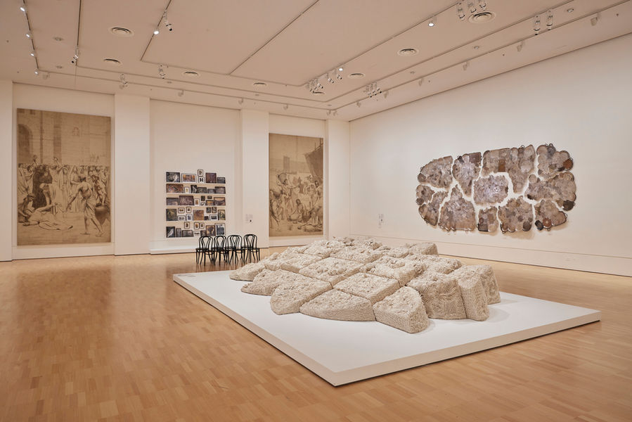 The work that first brought Lin international recognition was She (2016). The large scale textile installation consists of densely knotted cotton forms cascading across the wall, producing a powerful physical presence within the exhibition space.