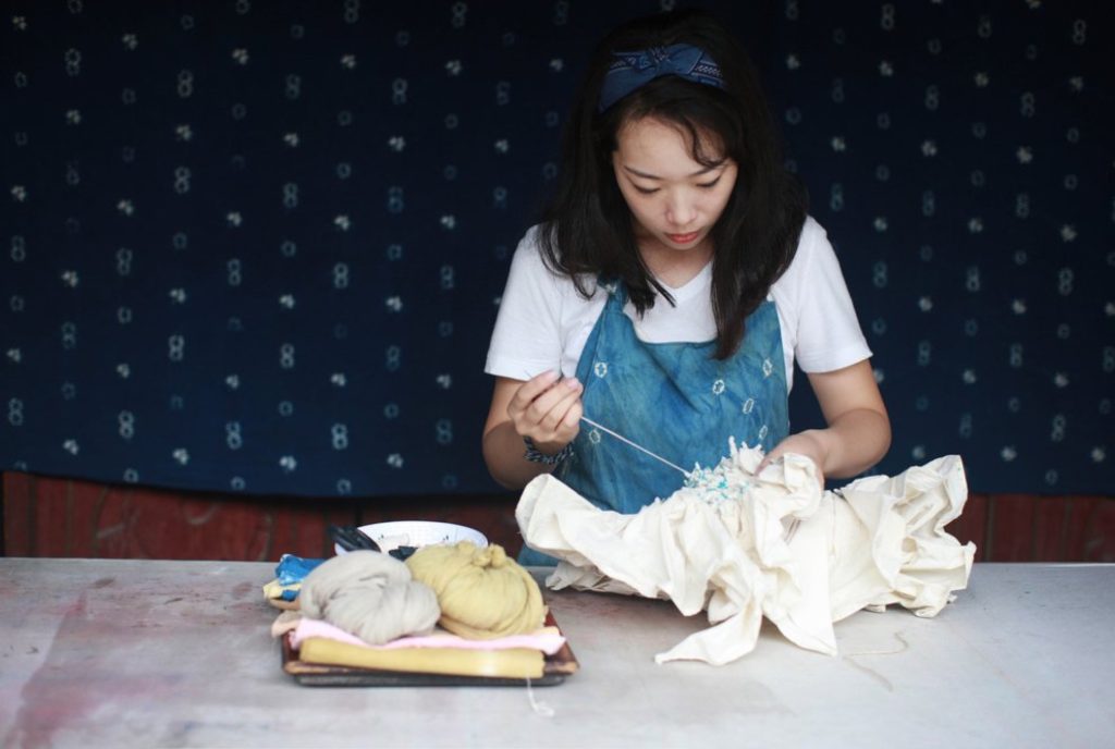 A turning point occurred during her research in Yunnan province. In Zhoucheng village she encountered the tie dye practices maintained by Bai women, a tradition that relies on the repeated actions of folding, stitching and binding cloth before immersing it in natural indigo dye. When the bindings are removed, the fabric reveals patterns created through resistance to dye.