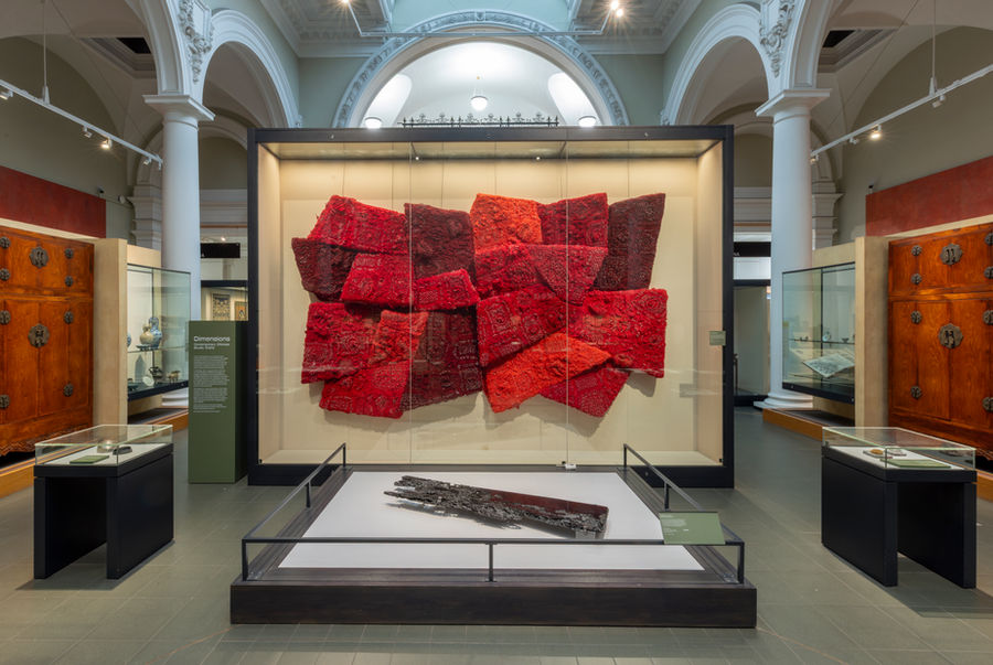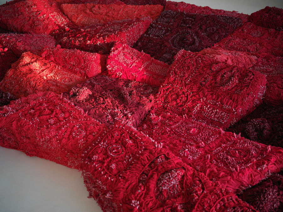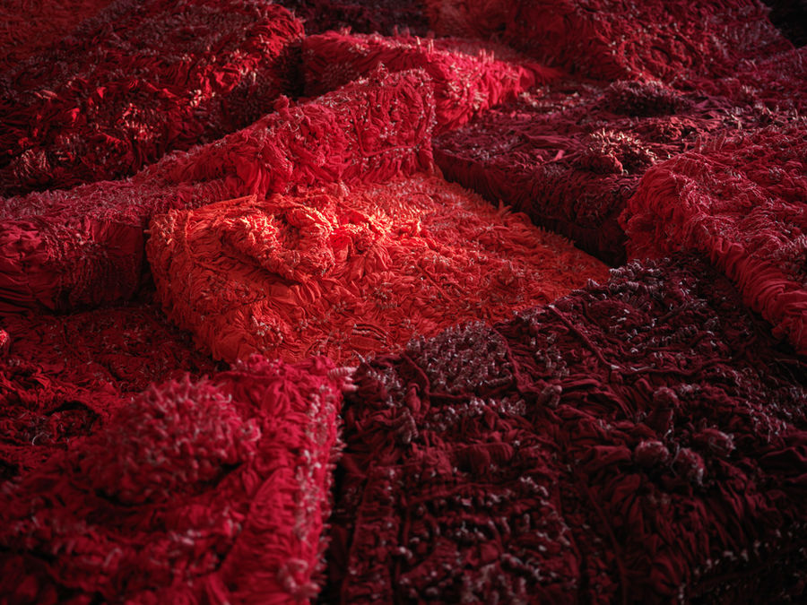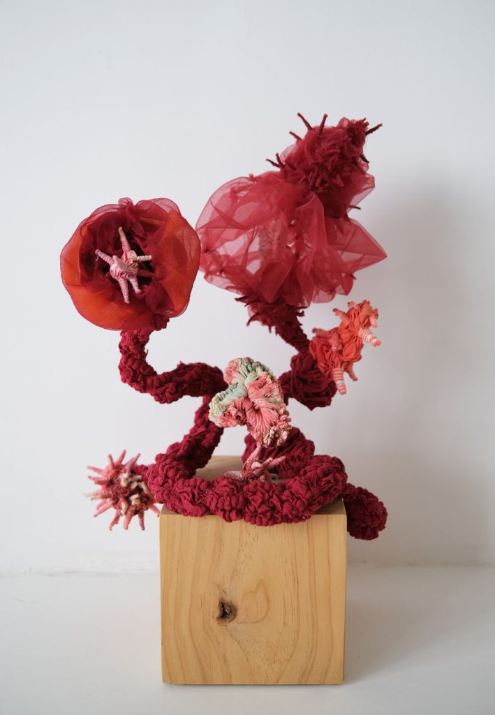 In more recent projects Lin has expanded her palette through the introduction of red dyed textiles. The shift alters the emotional register of the sculptures. Where indigo suggests distance and restraint, red introduces warmth and intensity. The colour recalls blood, vitality and cycles of life.