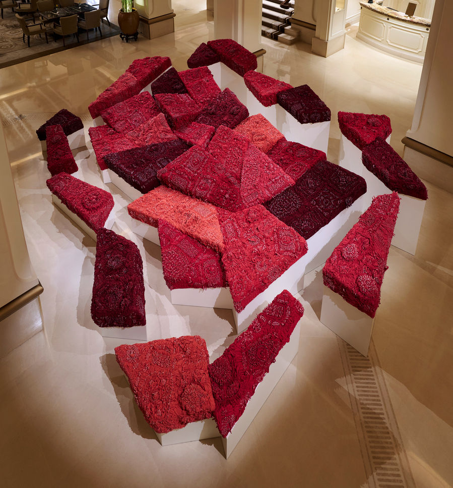 Another significant project emerged through the Art in Resonance programme organised by The Peninsula in collaboration with curatorial advisors from the Victoria and Albert Museum. For this initiative Lin created She’s Bestowed Love, an installation composed of red dyed textile forms. The sculpture evokes organic growth and circulating energy while expanding the emotional vocabulary of her work.