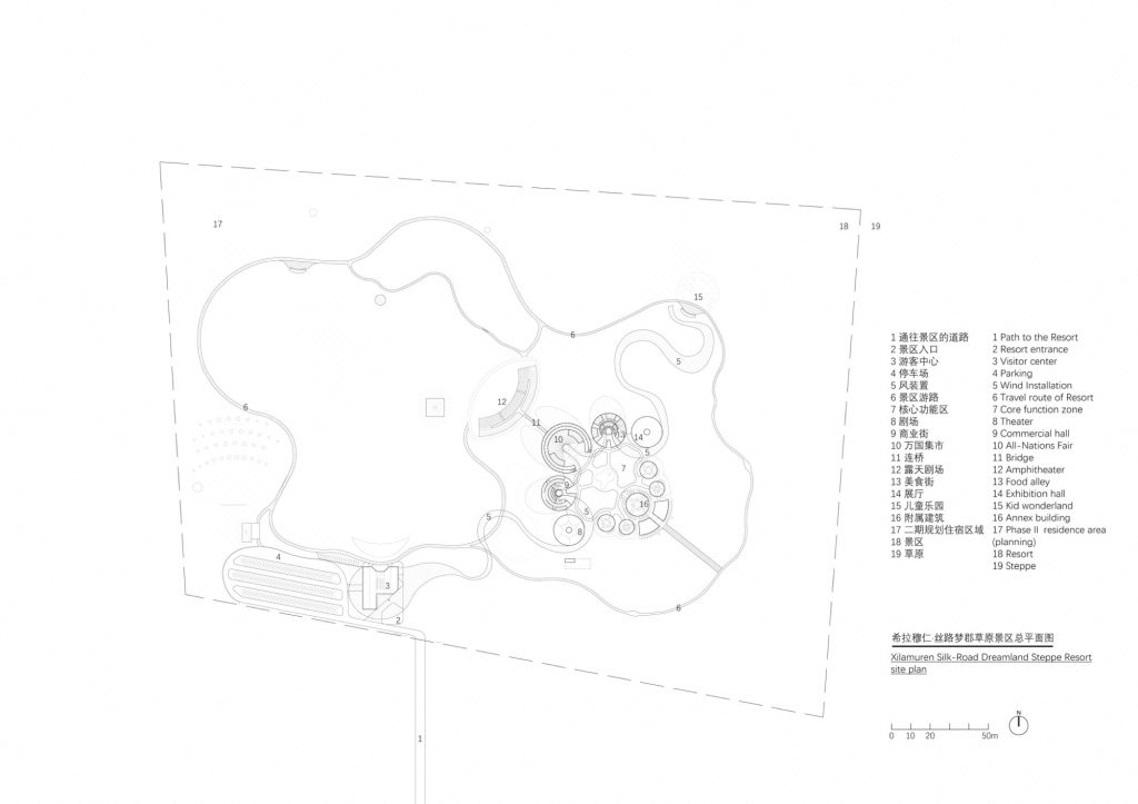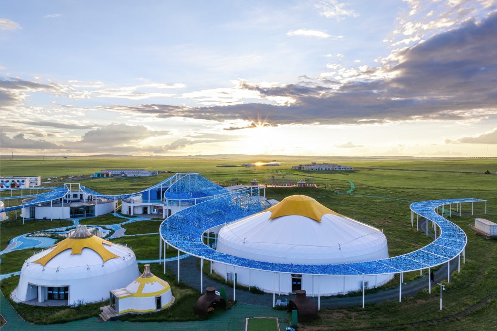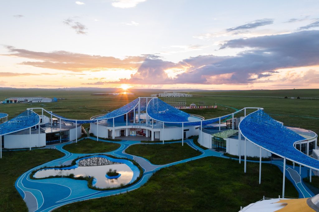 The masterplan unfolds along a hydrological corridor that links Swan Lake to the Xilamuren River. Rather than treating circulation as a paved grid imposed on the grassland, the resort builds a living route that follows water as a connective tissue. This blue thread generates a legible, walkable sequence of destinations while functioning as an ecological spine, supporting microclimates, biodiversity, and a softer relationship between human presence and the steppe.