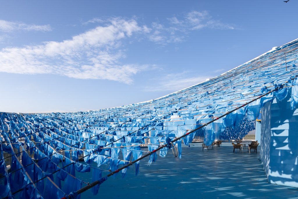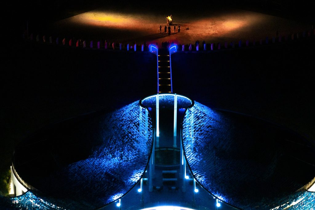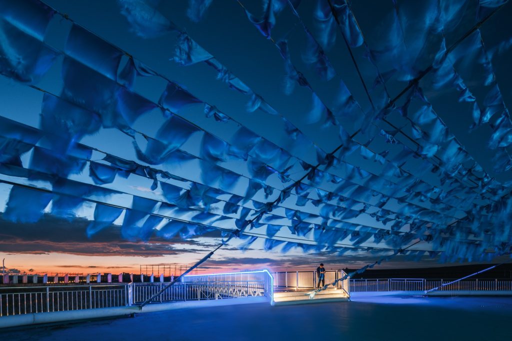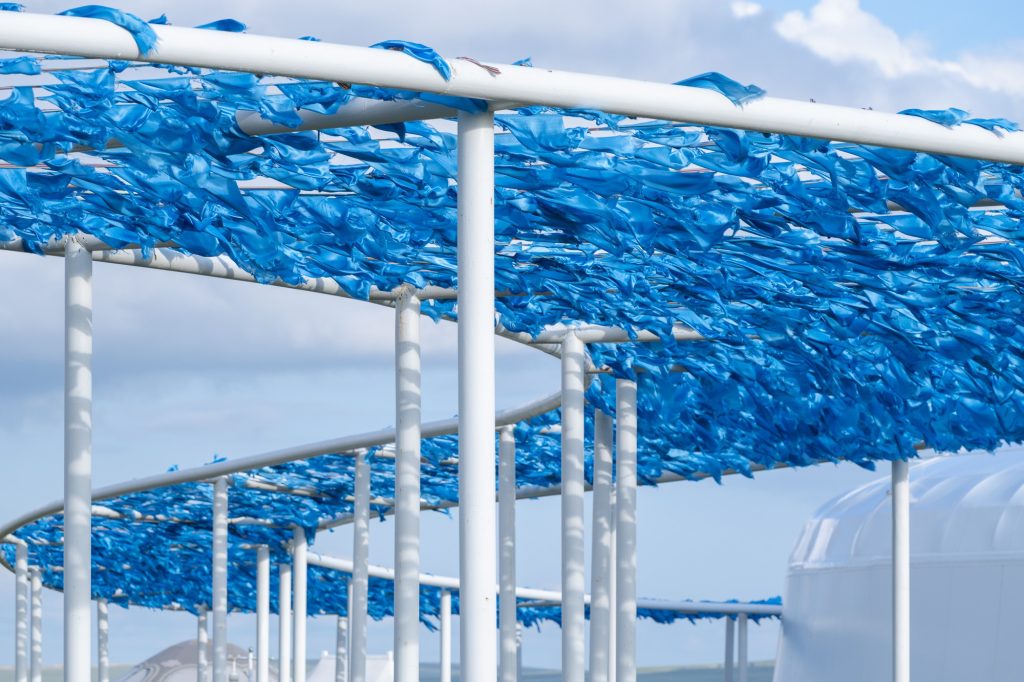 If water is the project’s spine, wind is its voice. A kinetic installation composed of white steel and blue cloth translates the steppe’s most intangible force into a visible, moving landmark. Animated by changing gusts, it evokes the image of the Tengri River in the sky, turning climate into choreography and offering a symbol that is both local in spirit and contemporary in form. It is an artwork that never repeats itself, measuring time by weather, and presence by motion.