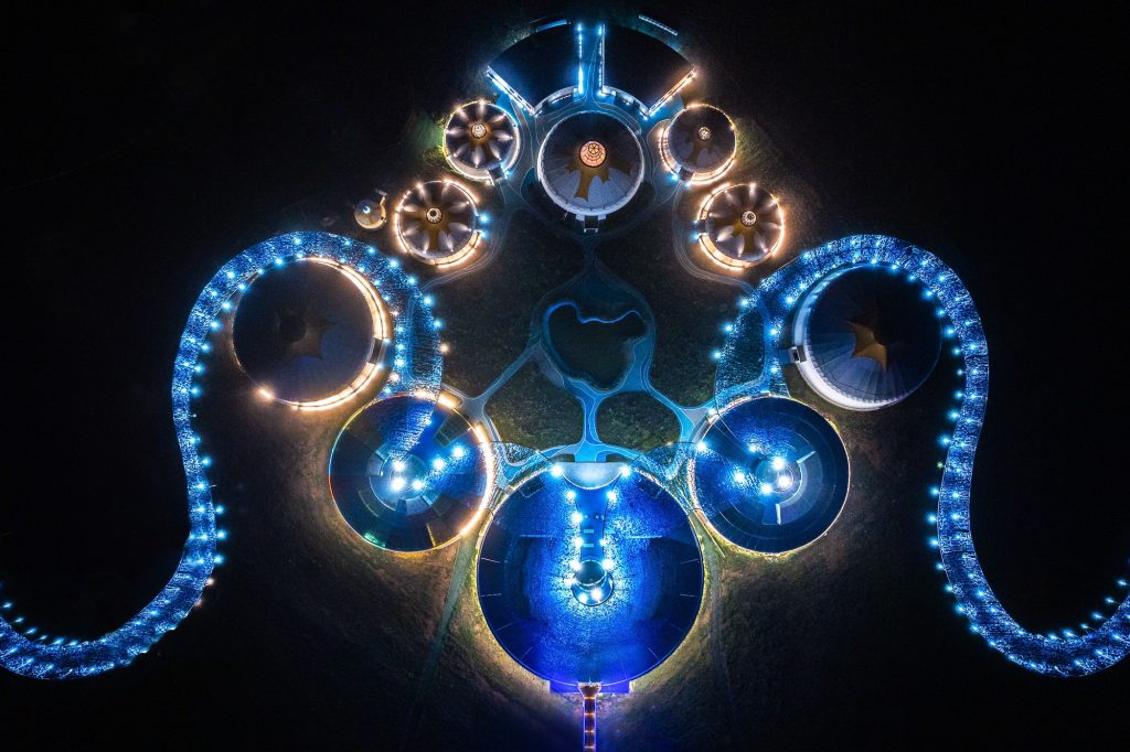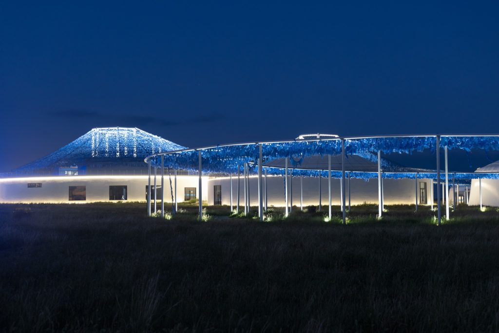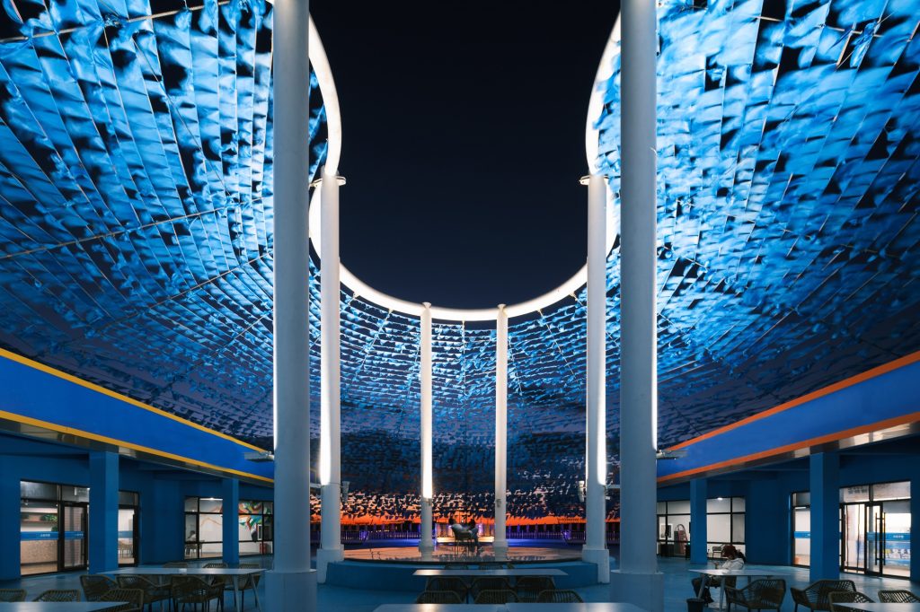 Material choices reinforce the project’s ambition for longevity with restraint. PTFE membranes introduce a lightweight envelope suited to harsh climates, balancing durability with reduced structural demand. Combined with regional building knowledge and construction techniques, the architecture aims for low energy operation and a quieter carbon footprint, framing decarbonization not as an add on, but as an embedded design ethic. The amphitheater continues this approach, settling into the terrain so it reads as an extension of the land rather than an object placed upon it, amplifying the sense of belonging while keeping the horizon intact.