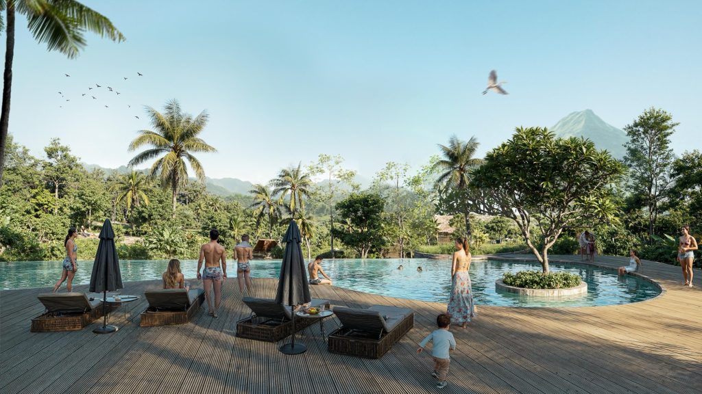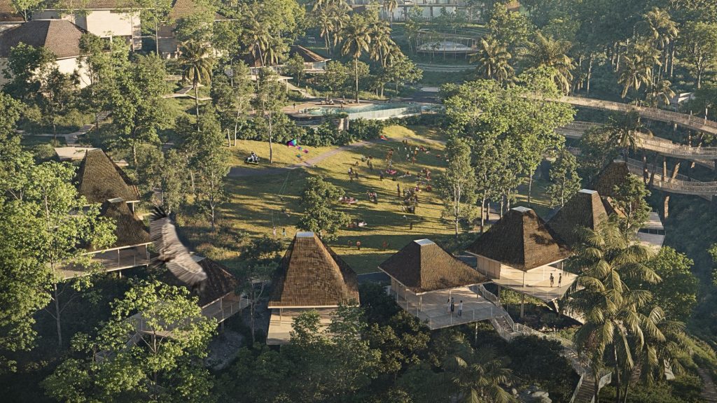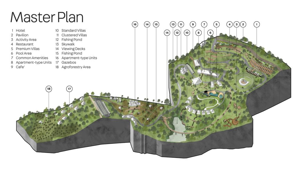 Moving downslope, villas and amenities are placed lightly on the terrain. Referencing the bahay kubo, structures are elevated and open, allowing air, light, and vegetation to pass through rather than be shut out. Natural pools, rain catchment areas, and raised walkways extend the idea of comfort beyond enclosed interiors, treating microclimate as a design material.