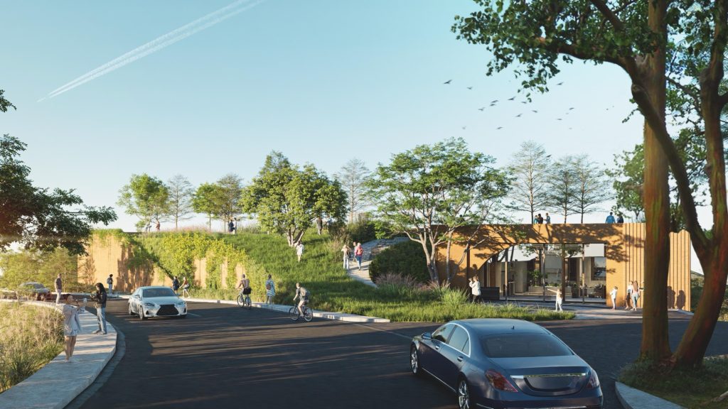 At the highest point near the road, the arrival zone acts as a civic threshold with the restaurant, hotel, and pavilion. Green roofs, open decks, and permeable structures keep the ground plane legible and continuous, so visitors meet the landscape first, not a façade.