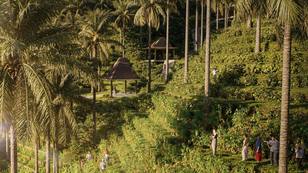 At the centre, the project becomes explicitly productive: a working permaculture farm where guests and farmers share planting, harvesting, markets, and learning spaces. Leisure, education, and livelihood overlap in the same ground, making the landscape both experience and infrastructure.