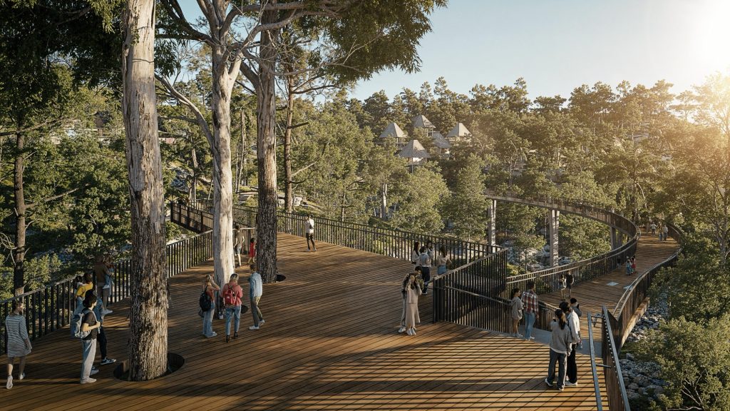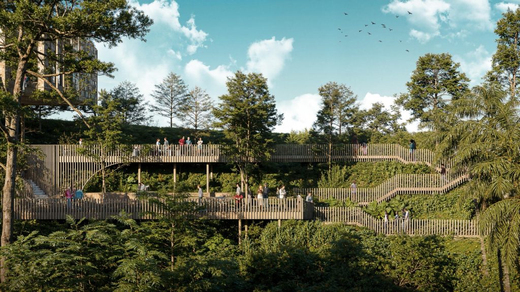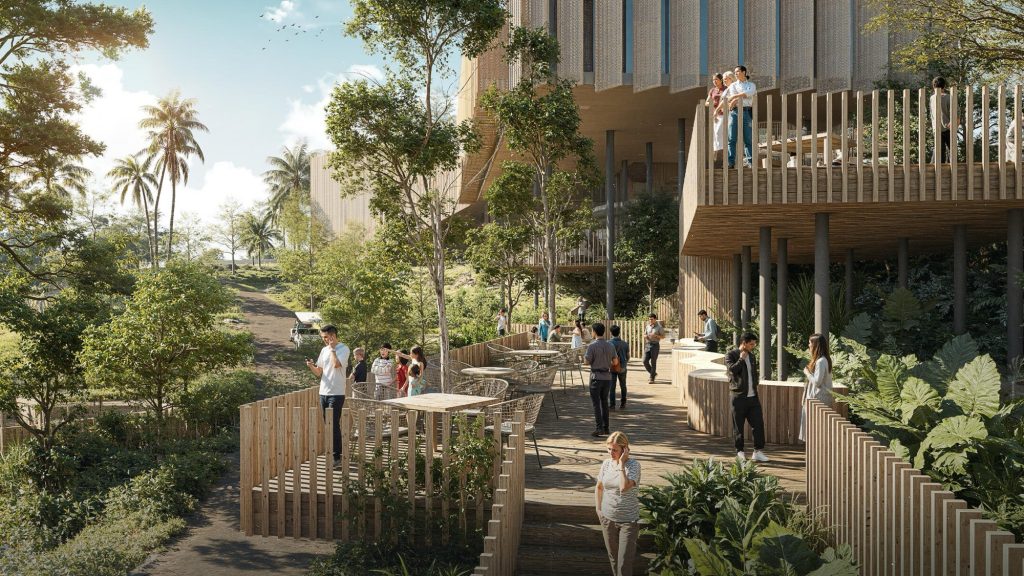 Environmental targets are embedded early. Rain catchment systems are planned to supply up to 50 percent of irrigation demand, while passive cooling strategies aim to lower indoor temperatures and reduce reliance on mechanical systems. Material and service procurement is intended to stay largely within a 50 kilometre radius, reinforcing local supply chains and craft economies rather than importing an image of sustainability from elsewhere.