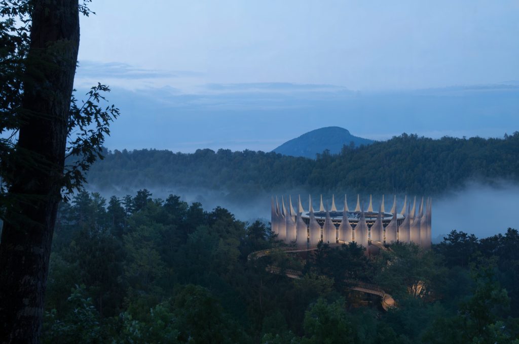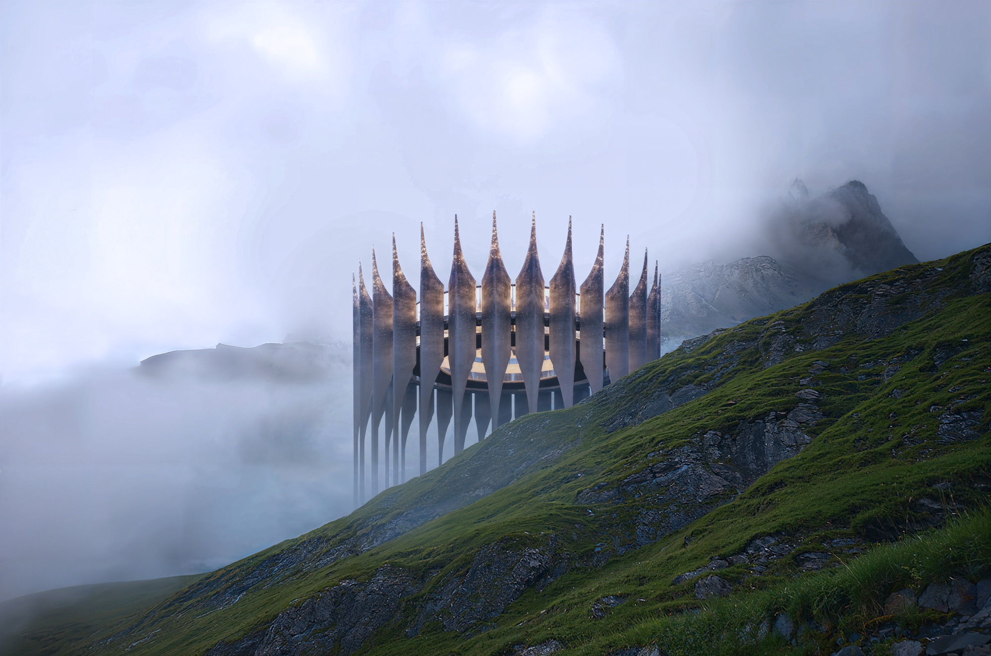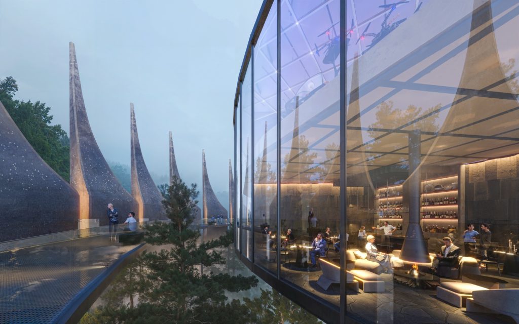 Architecturally, Lynx adopts what Sanina describes as a gothic futurist aesthetic, combining monolithic concrete forms with lightweight glazing. The building is organised as a series of concentric rings that reference ancient defensive fortresses, while a serrated perimeter wall forms vertical peaks that echo the surrounding ridgelines.