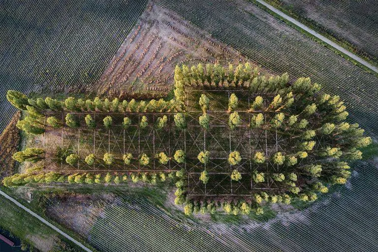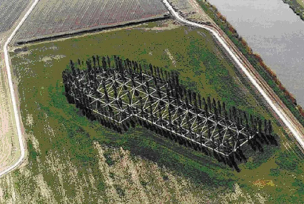 In the flat expanse of the Dutch polder near Almere, where land itself is an engineered idea, a cathedral appears without stone, roof, or wall. Marinus Boezem’s The Green Cathedral began as a proposal in 1978 and was planted in 1987, formed by 178 Italian poplars set out to mirror the ground plan of Notre-Dame de Reims. As the trees mature, they rise toward architectural height through biological time, turning a Gothic outline into a living, changing volume. The work measures roughly 150 metres by 75 metres, and the poplars can reach around 30 metres when grown, yet its true scale is temporal rather than monumental. It is constructed from seasons, decay, replacement, and return.