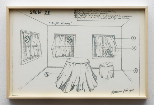 This approach is most clearly articulated in The Shows, a series of fifteen proposals developed between 1964 and 1969. These works employ air currents, temperature differences, and movement as structuring elements. In Immateriële ruimte (1965), visitors move through zones defined by warm and cold air. In Soft Room (1968), fans animate suspended textiles, transforming the exhibition space into a responsive environment. Participation is not symbolic but necessary. Without bodies moving through space, the work remains incomplete.