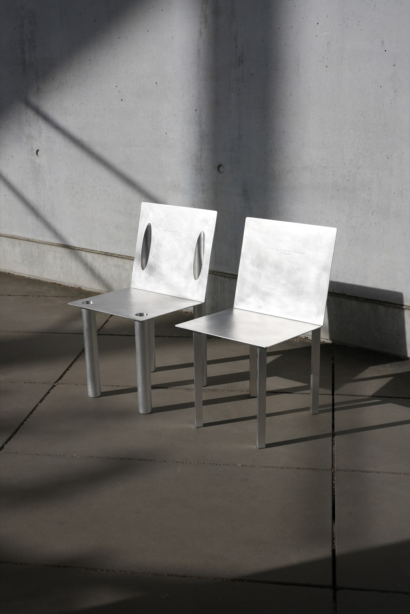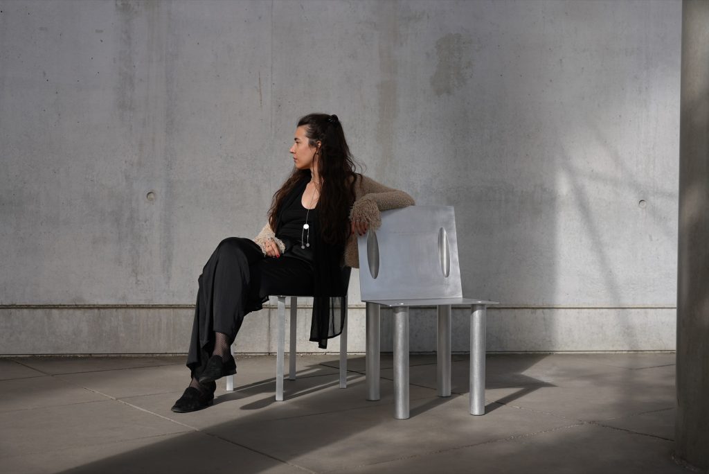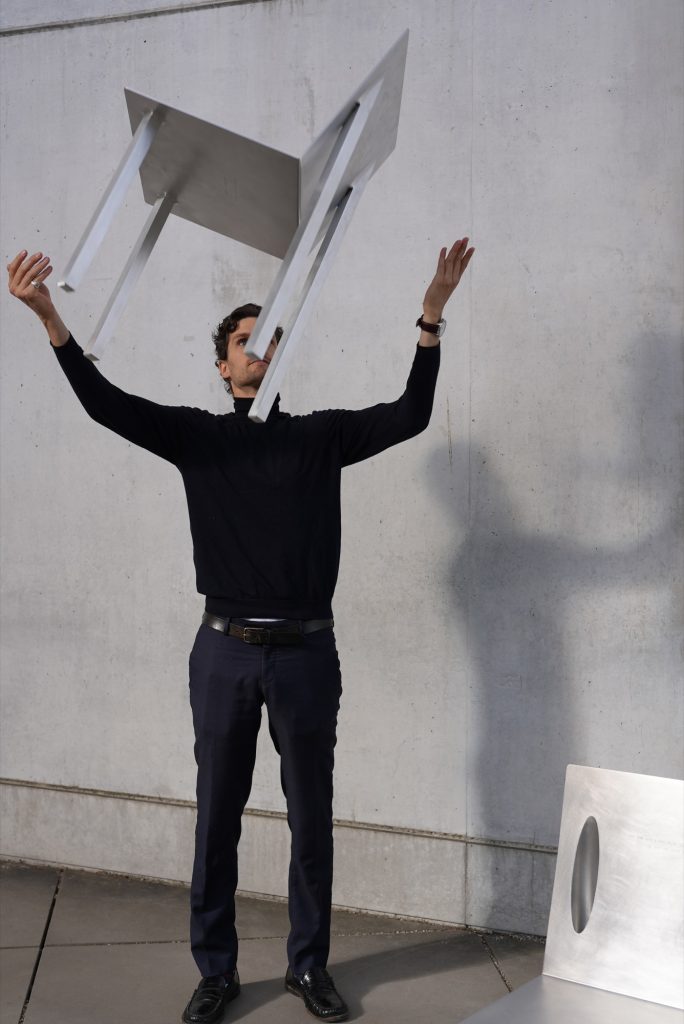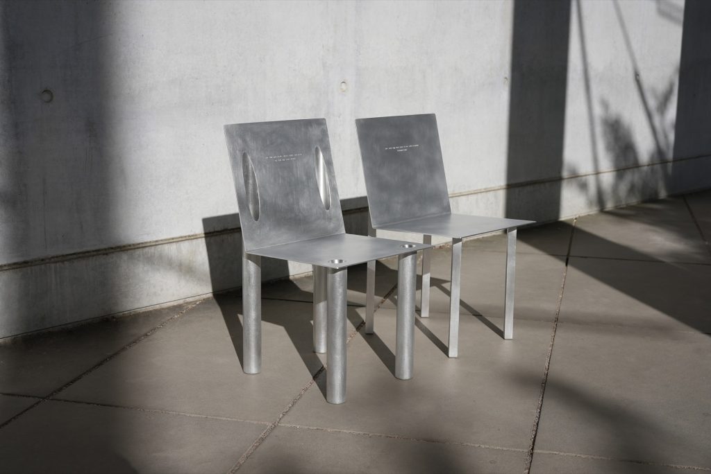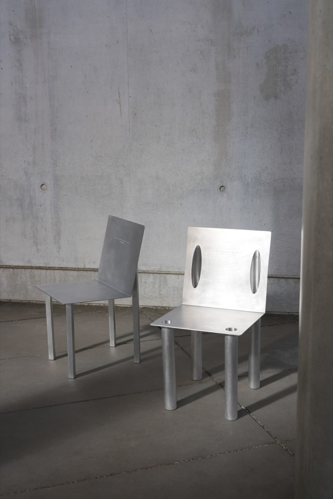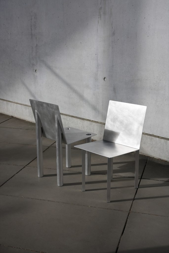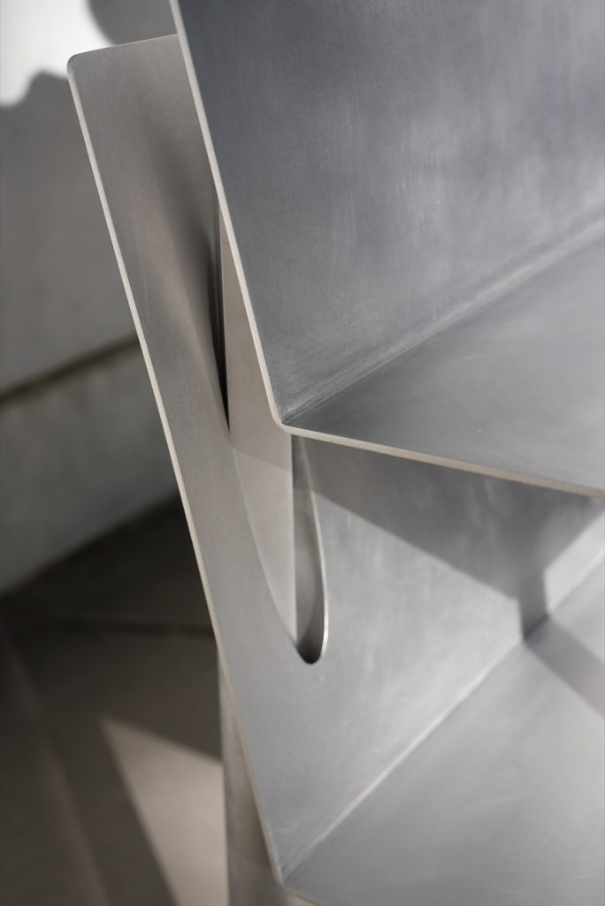 Crafted from aluminum, the chairs balance clarity with restraint. The material supports the project’s dual character, sharp edges and crisp lines on one hand, a refined, controlled finish on the other. The result is sculptural without becoming loud, allowing the interlocking mechanism and the silhouette to carry the narrative.